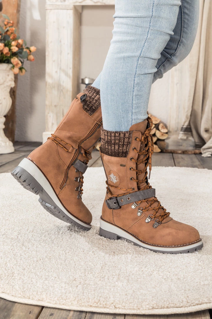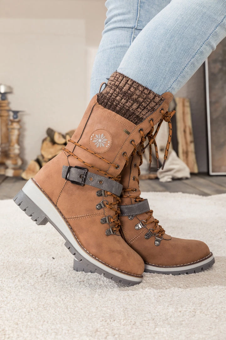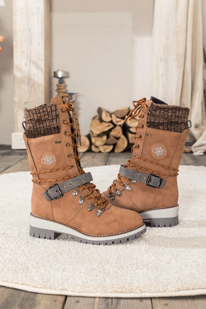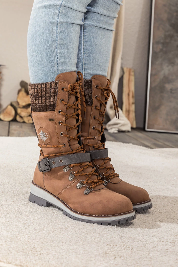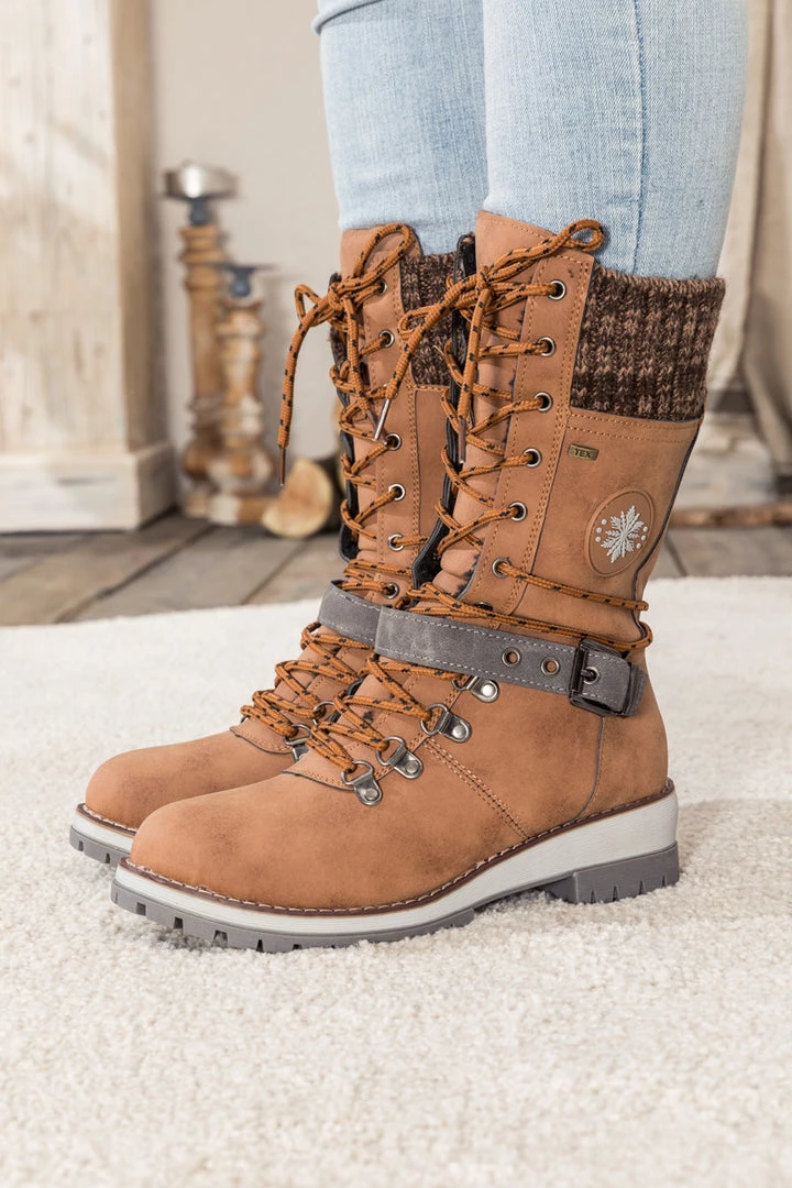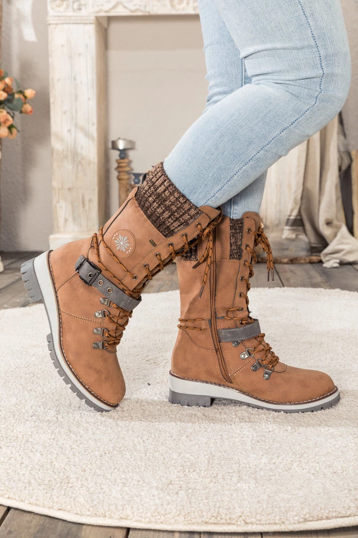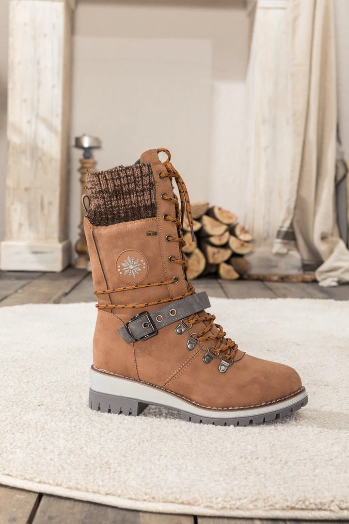 Combat the cold with these snow-ready boots equipped with cozy ribbed cuffs and chic buckled straps.