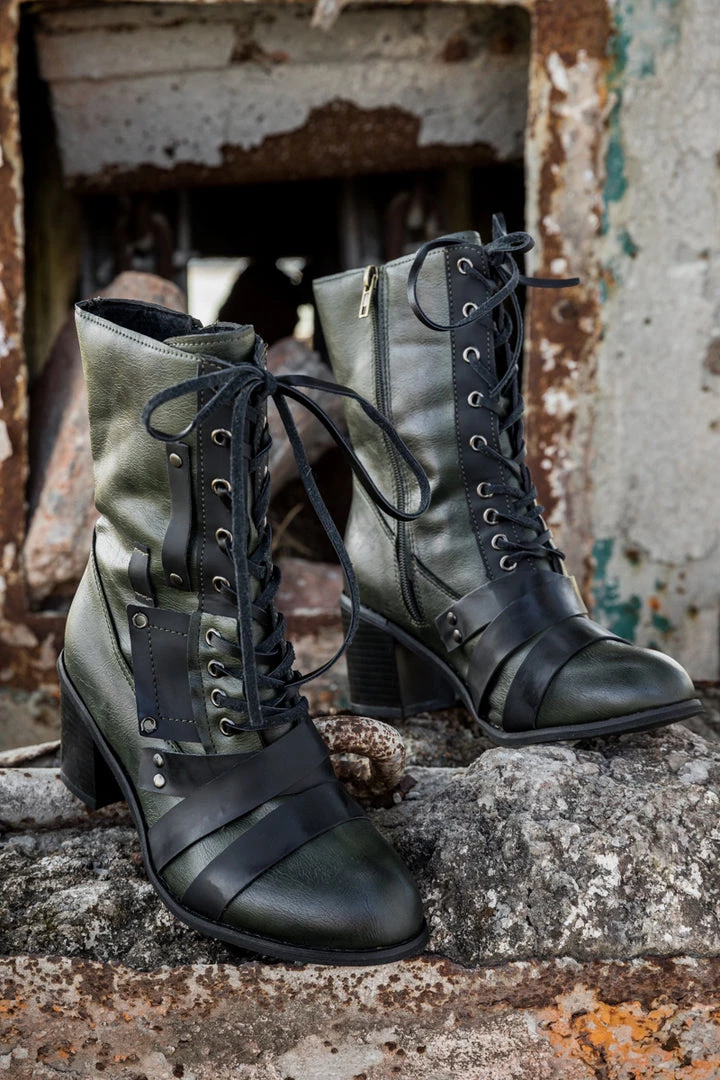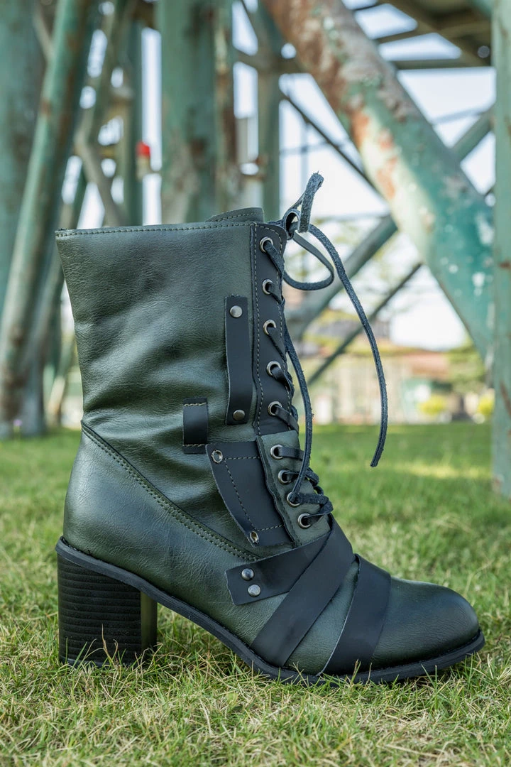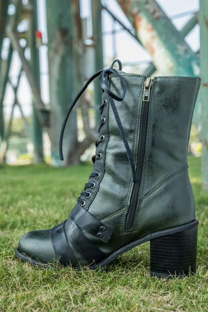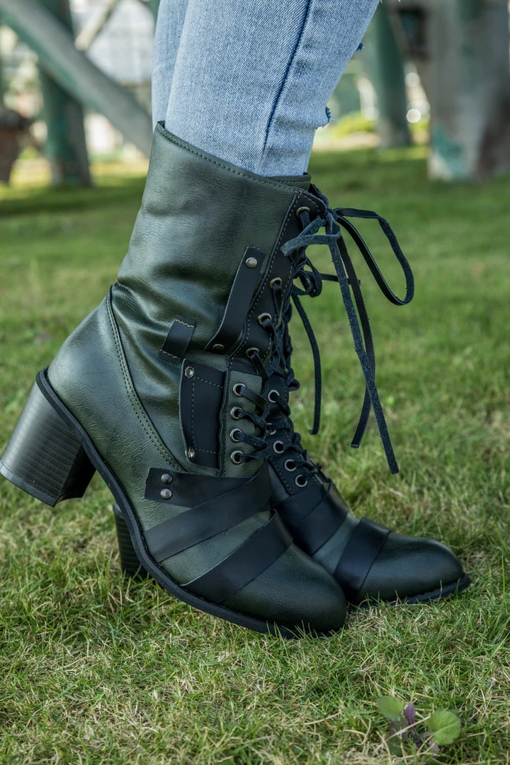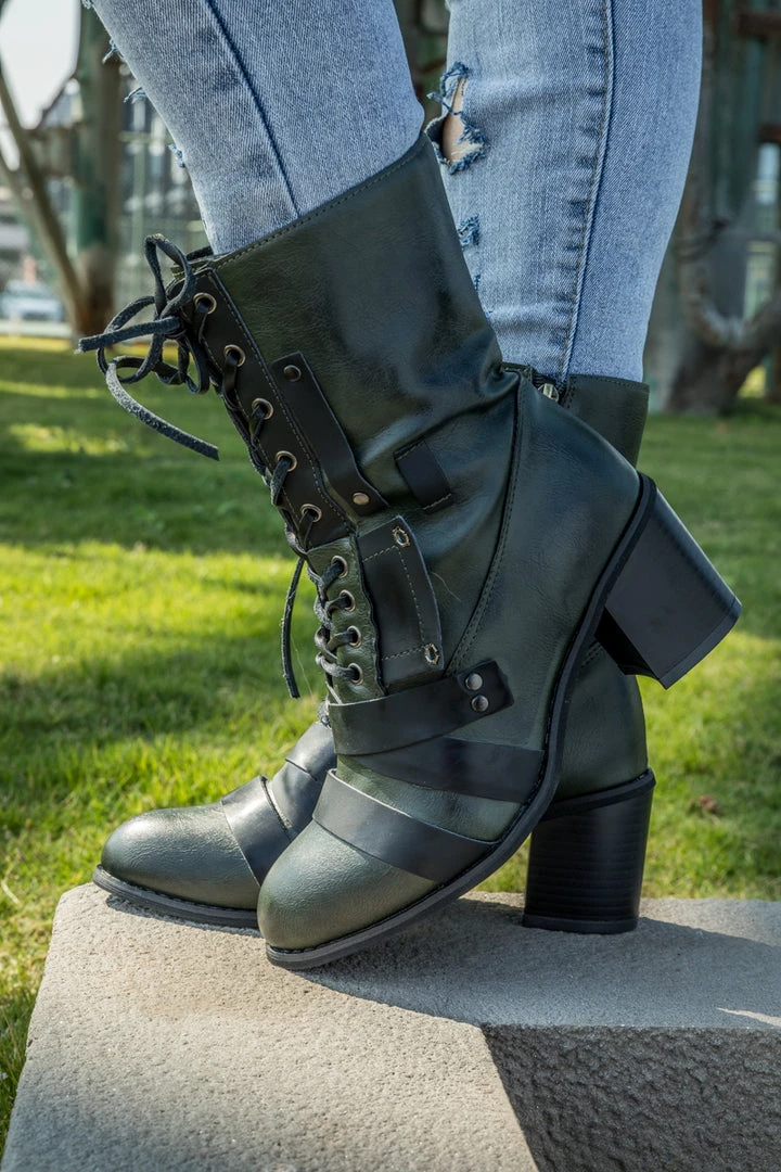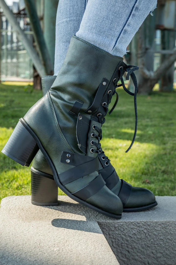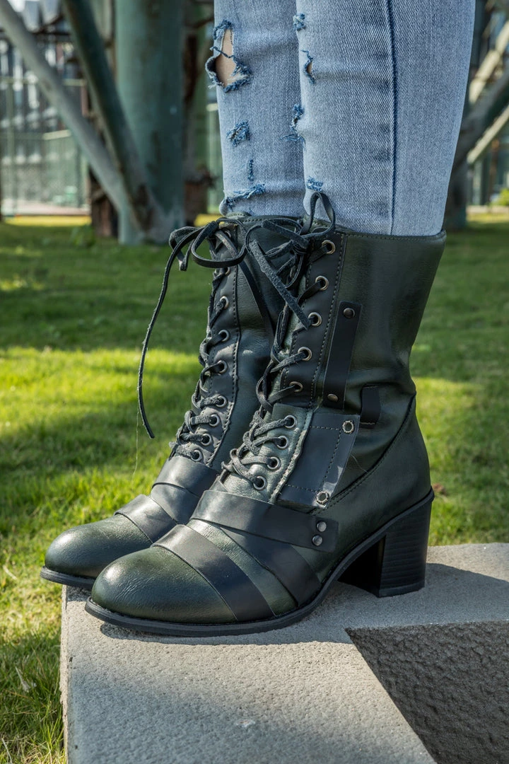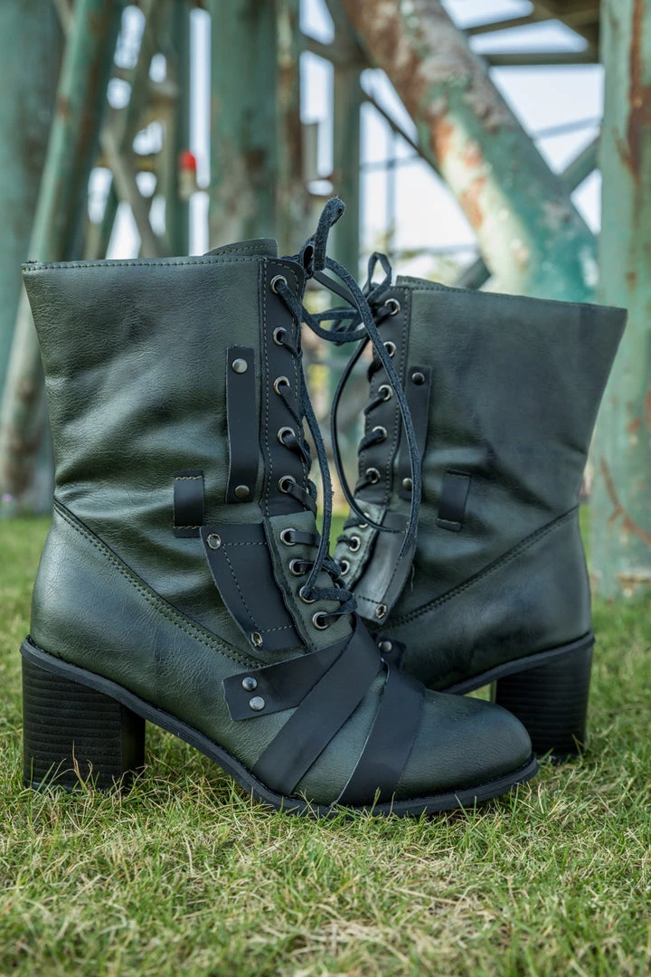 Include an edgy finish to your ensemble with these structured boots that host a strap patch design and subtle hues.