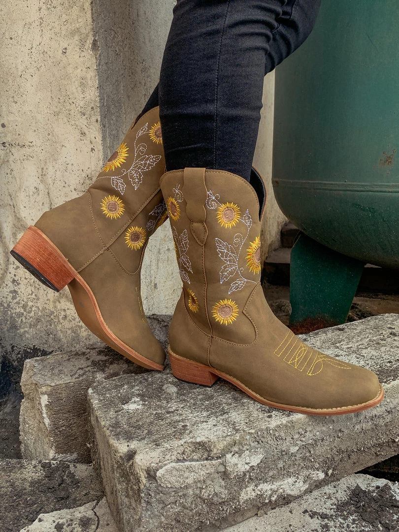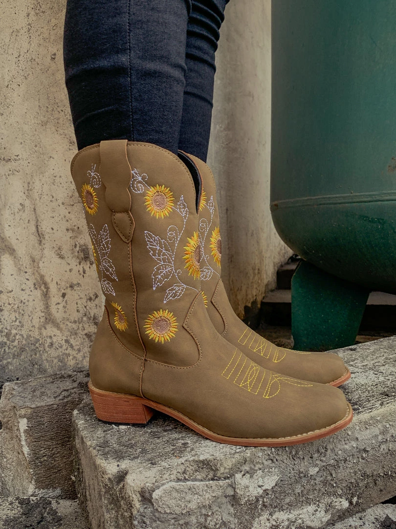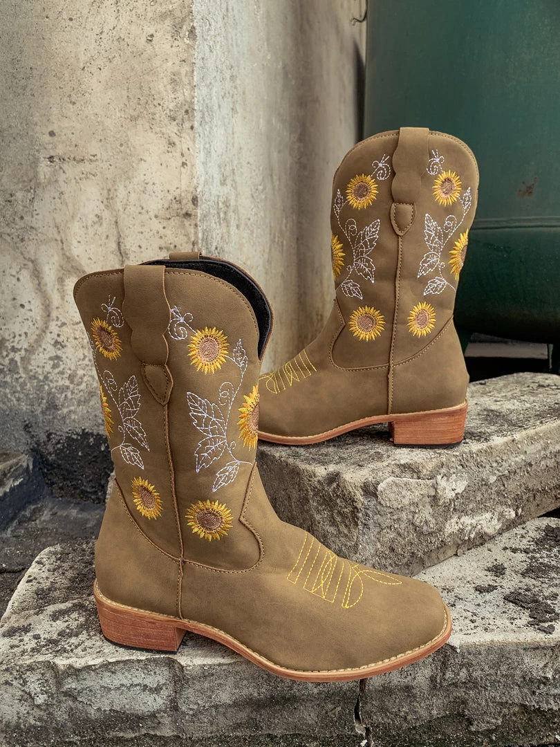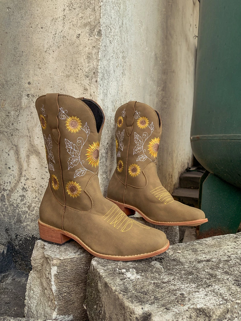 Spruce up your footwear collection with this western-style cowboy boot that boasts a charming embroidered sunflower design.