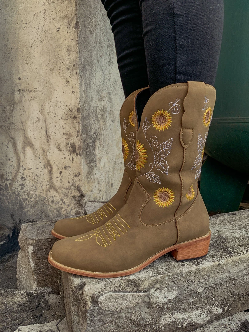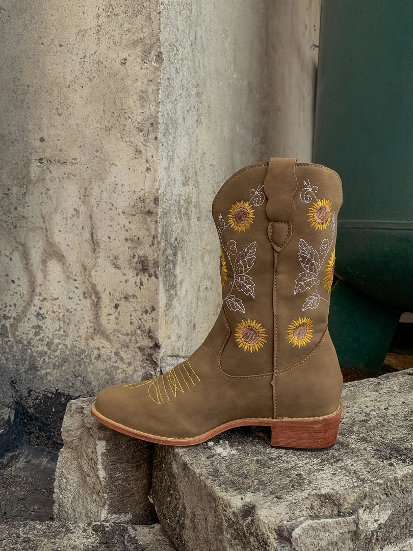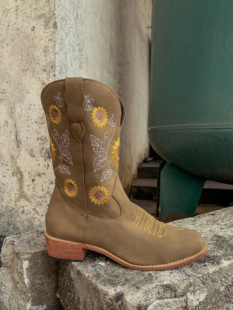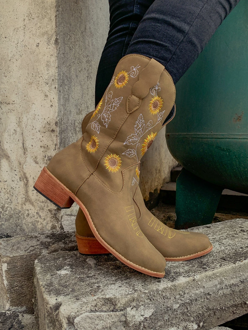 Spruce up your footwear collection with this western-style cowboy boot that boasts a charming embroidered sunflower design.
