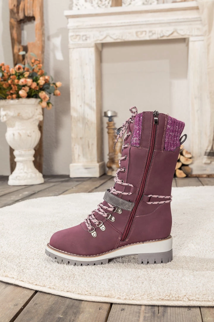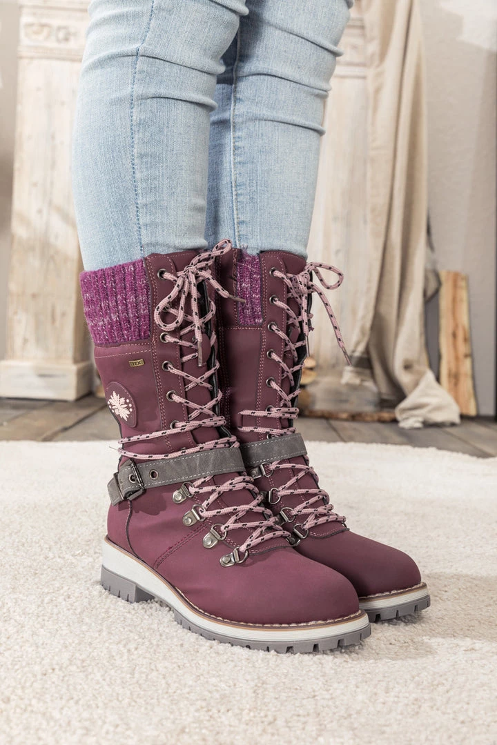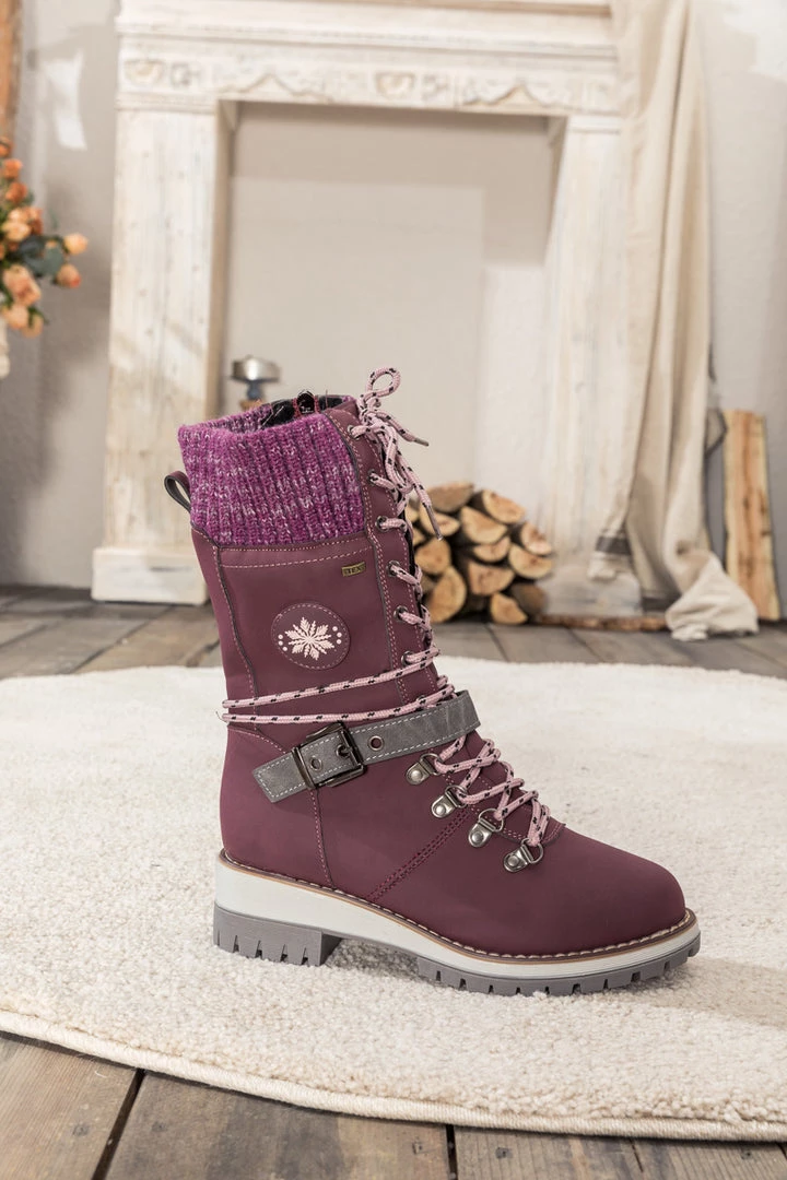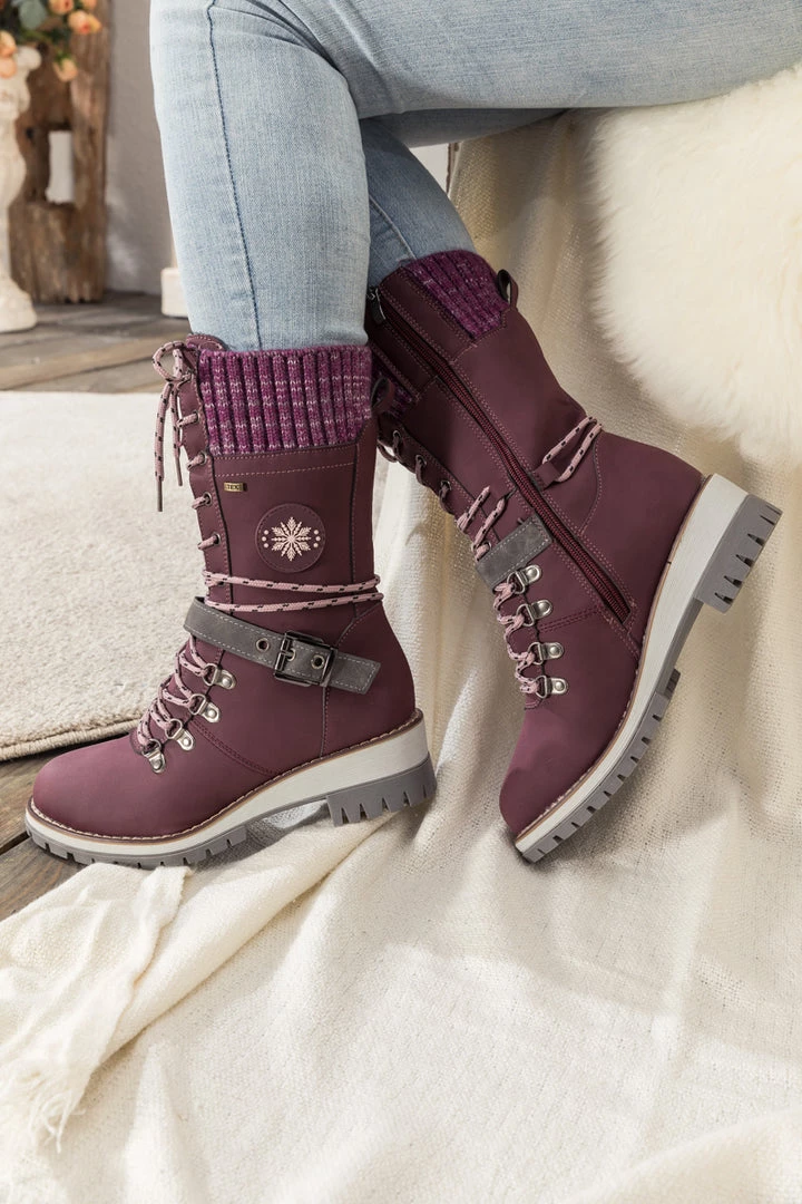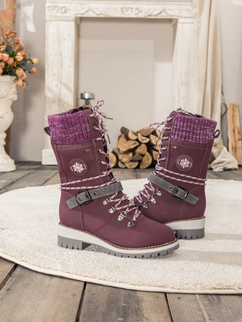 Combat the cold with these snow-ready boots equipped with cozy ribbed cuffs and chic buckled straps.