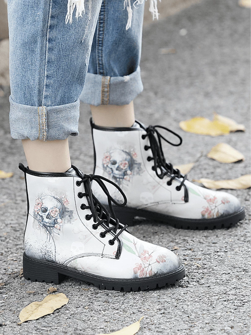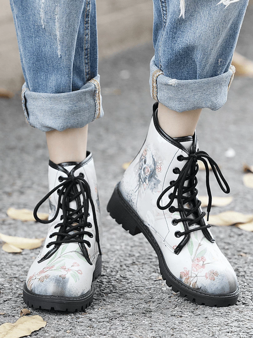 Edge up your style with these statement combat boots designed with a faded print that offers a feminine flair.
