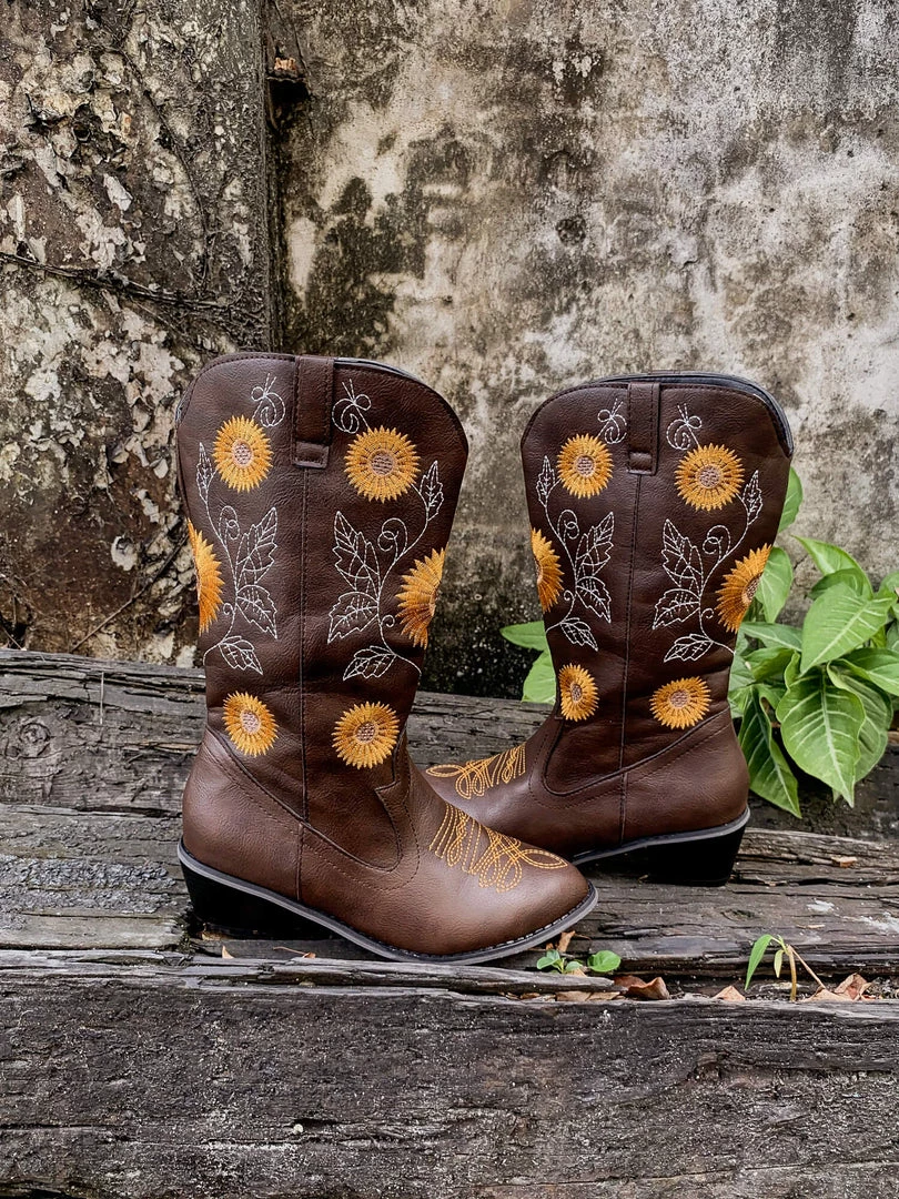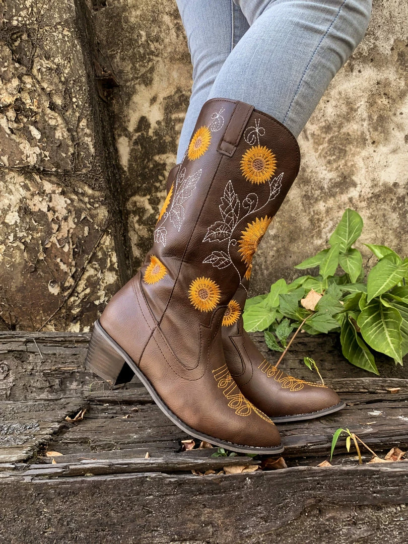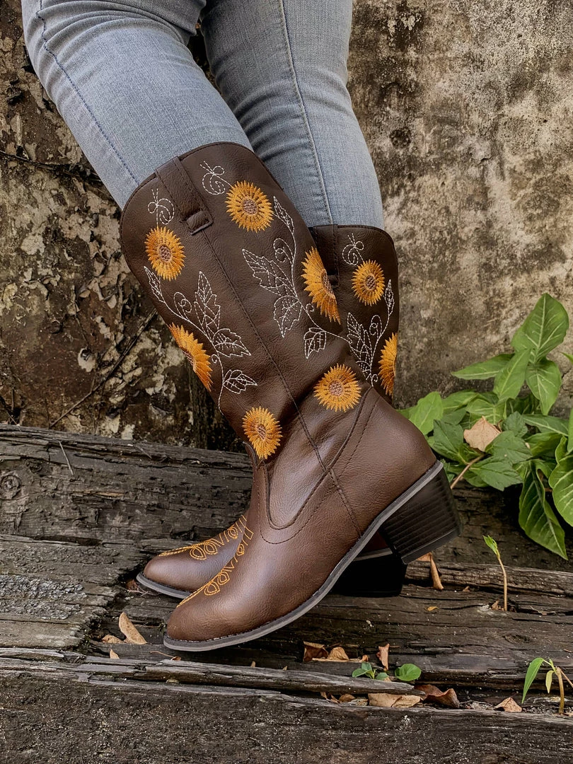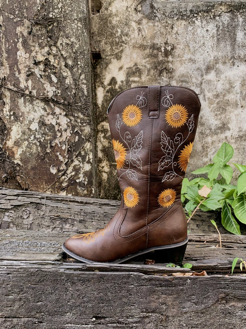 Send your ensemble in a wild west direction with this bold cowboy boot featuring a low, walkable heel and blooming embroidery.