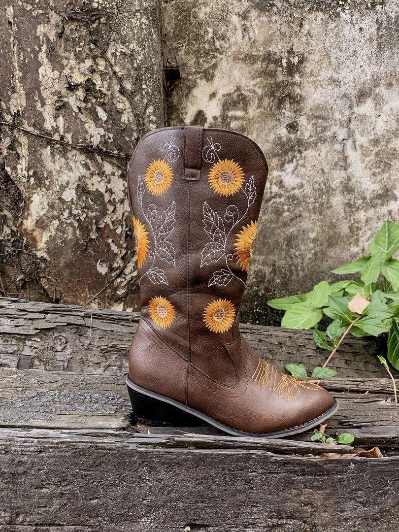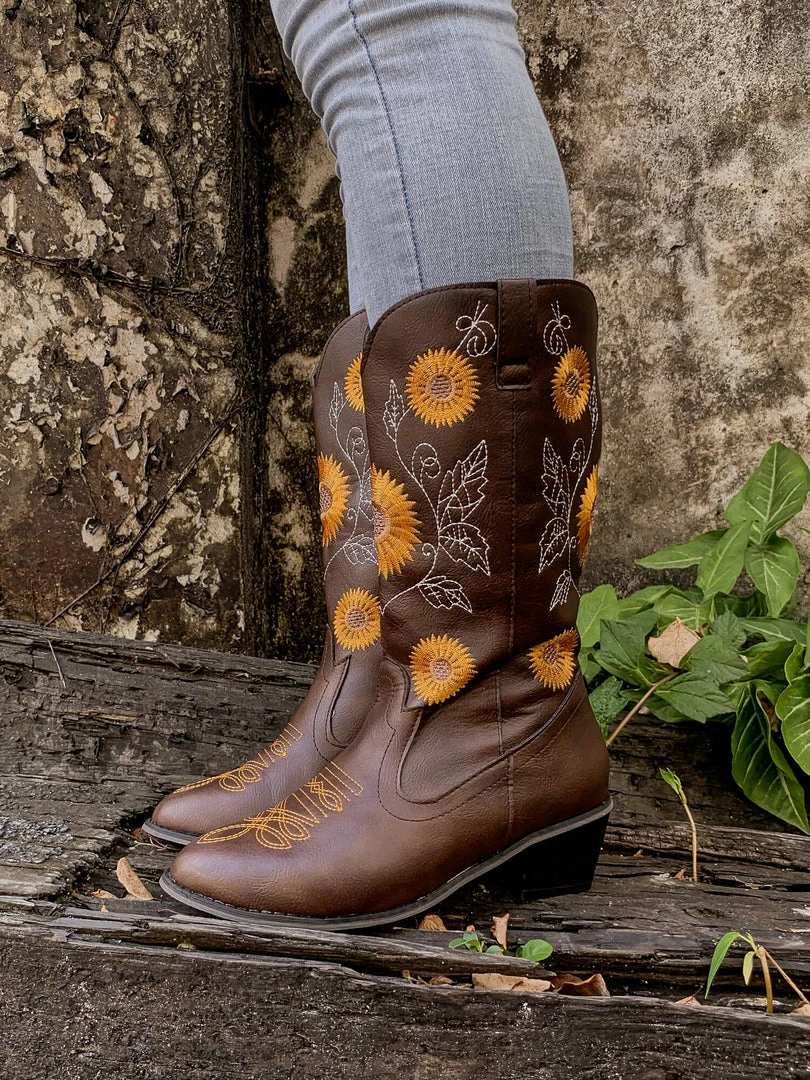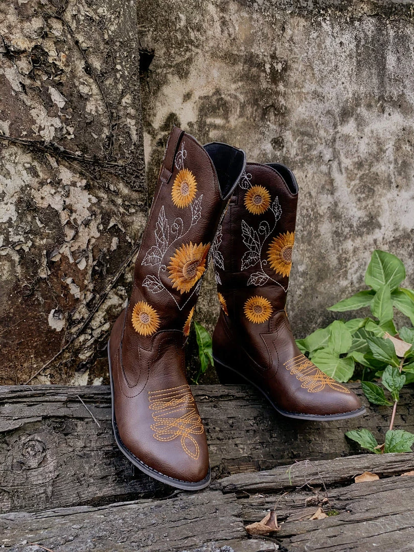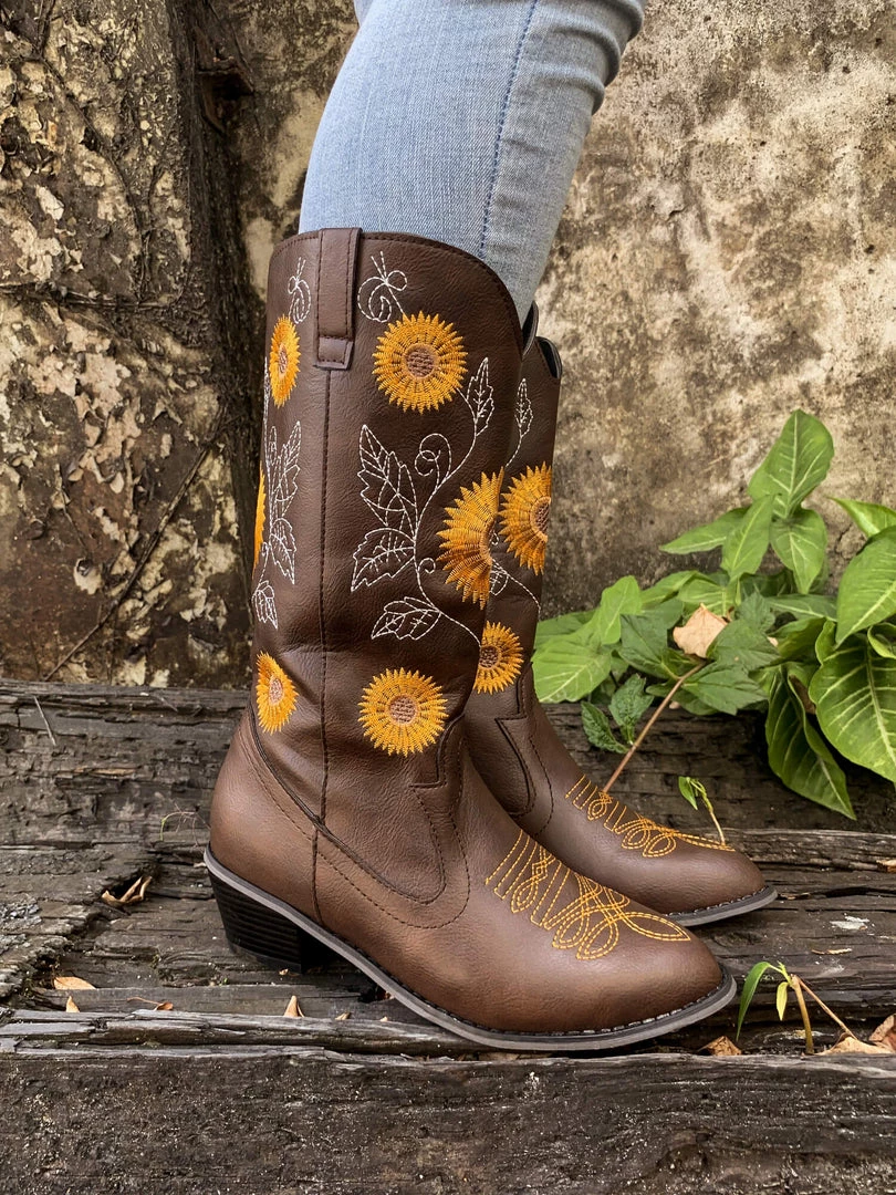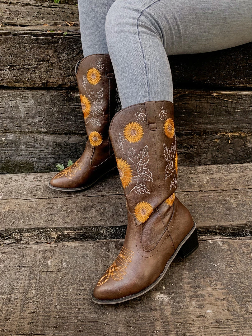 Send your ensemble in a wild west direction with this bold cowboy boot featuring a low, walkable heel and blooming embroidery.