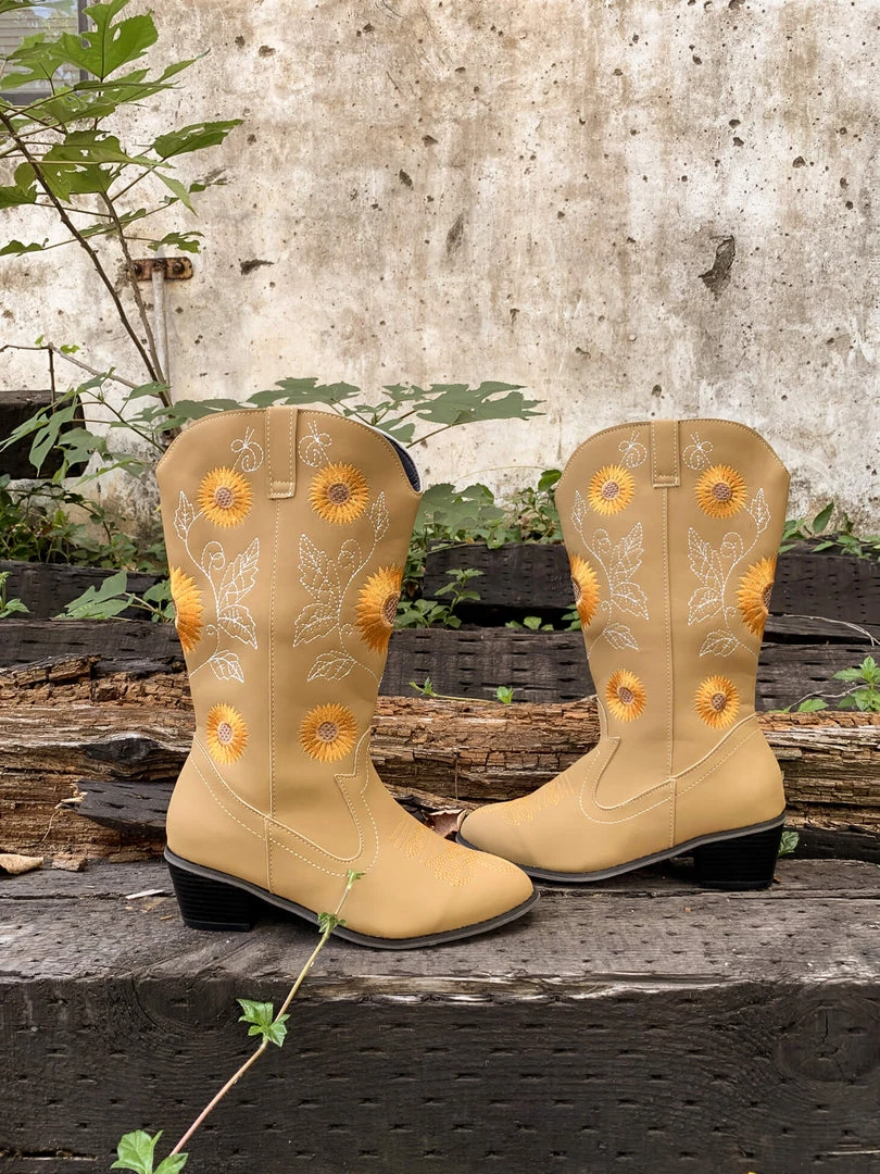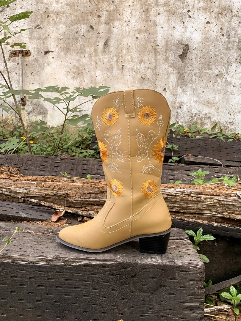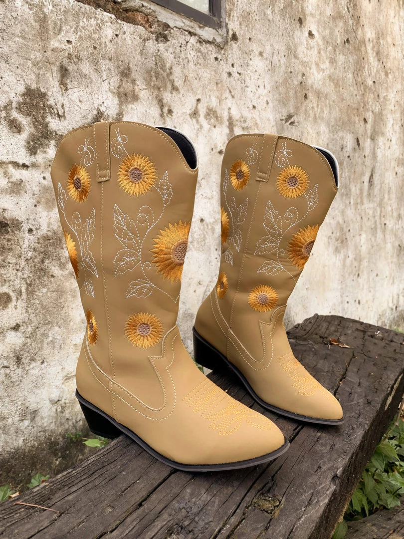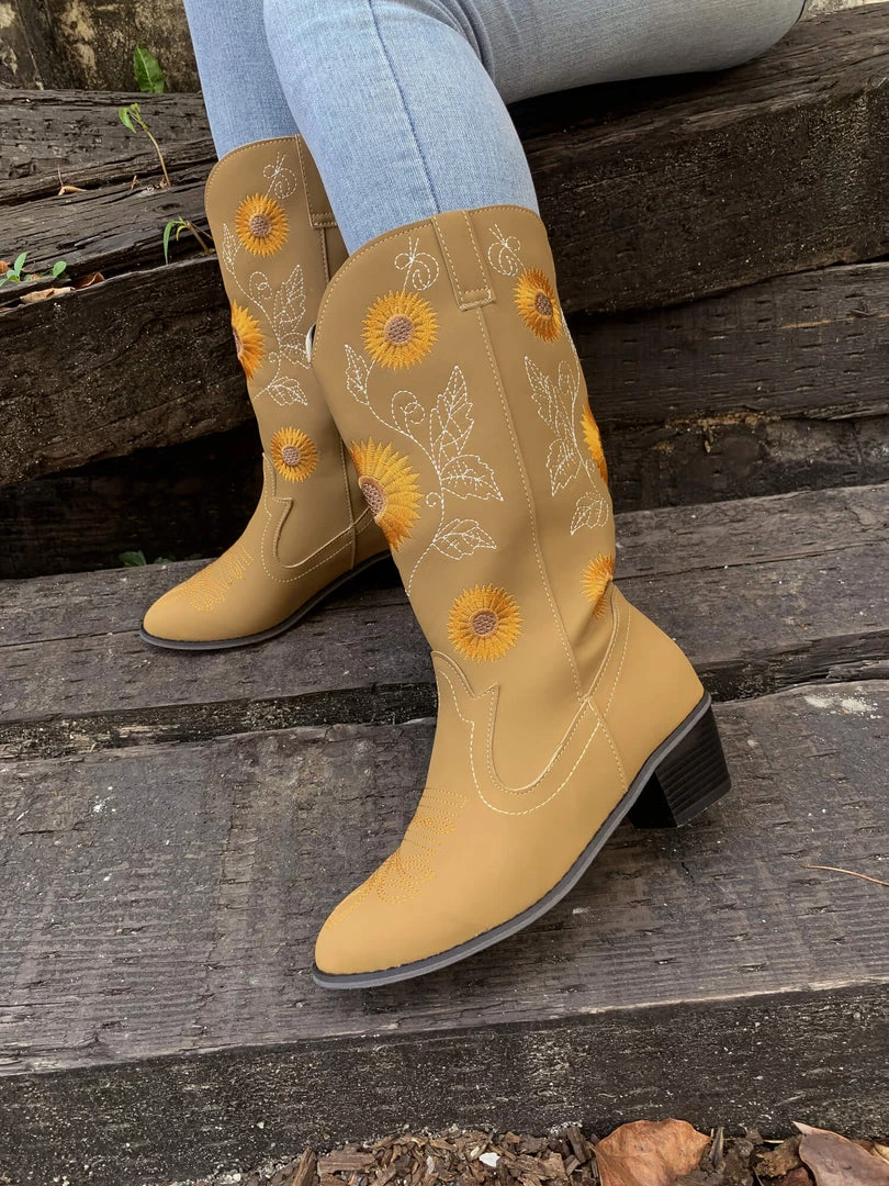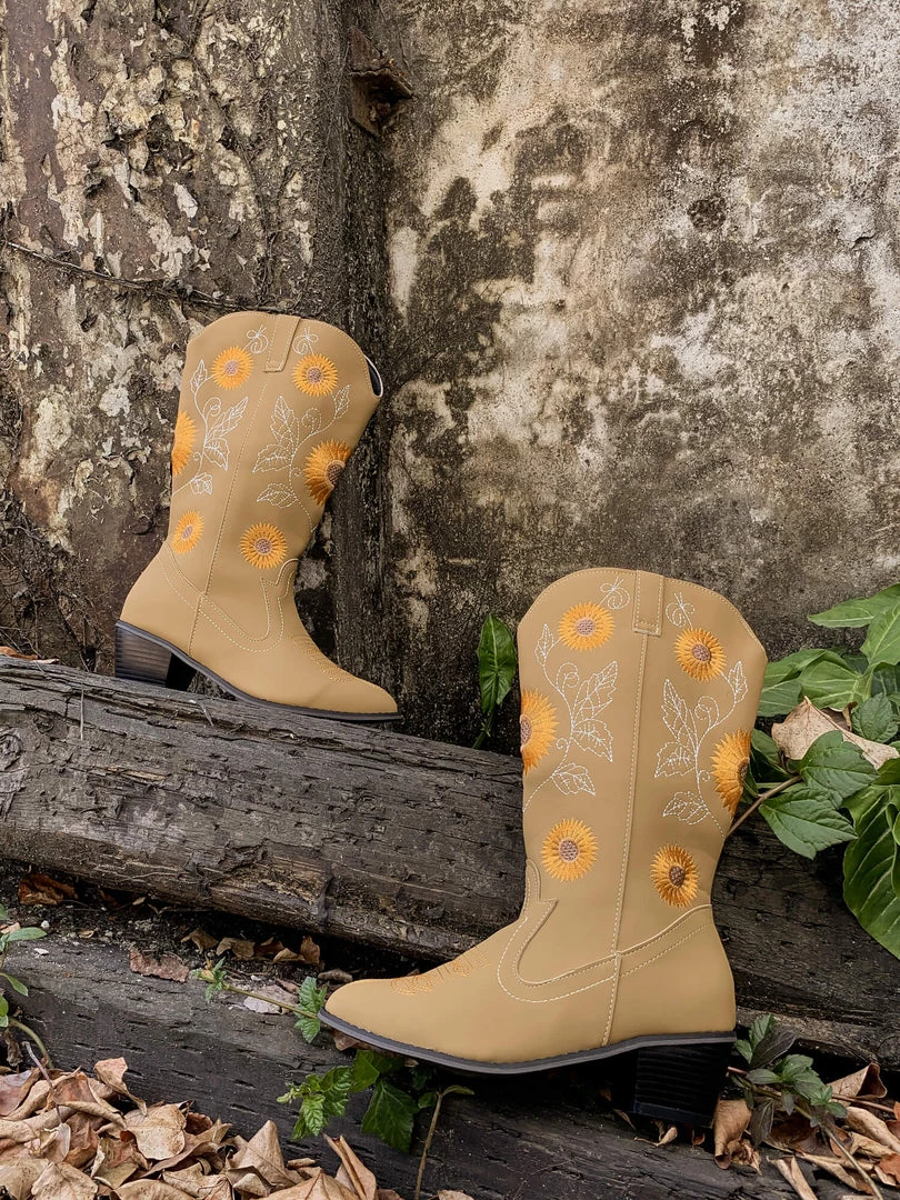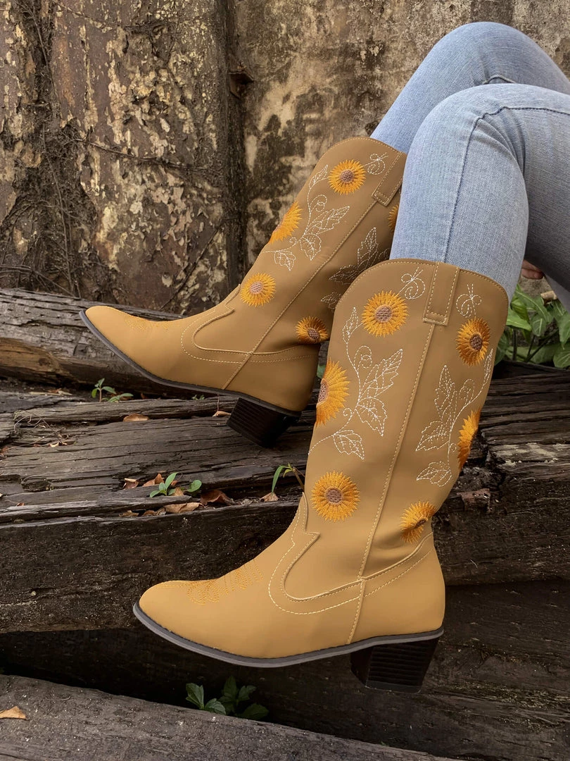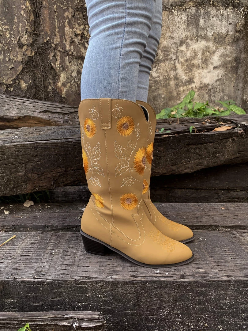 Send your ensemble in a wild west direction with this bold cowboy boot featuring a low, walkable heel and blooming embroidery.
