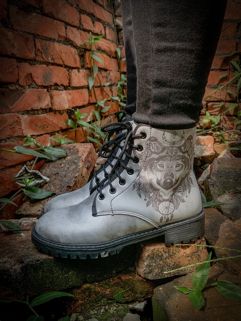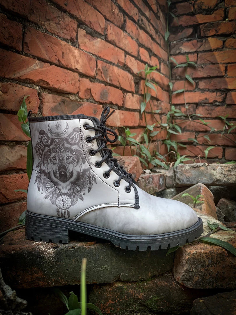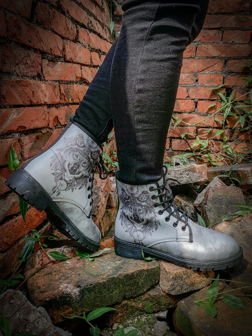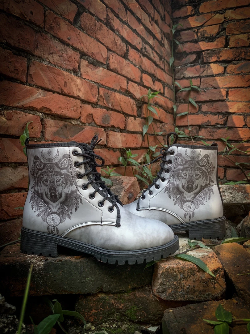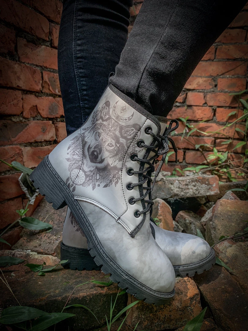 Edge up your style with these statement combat boots designed with a werewolf print that offers a feminine flair.