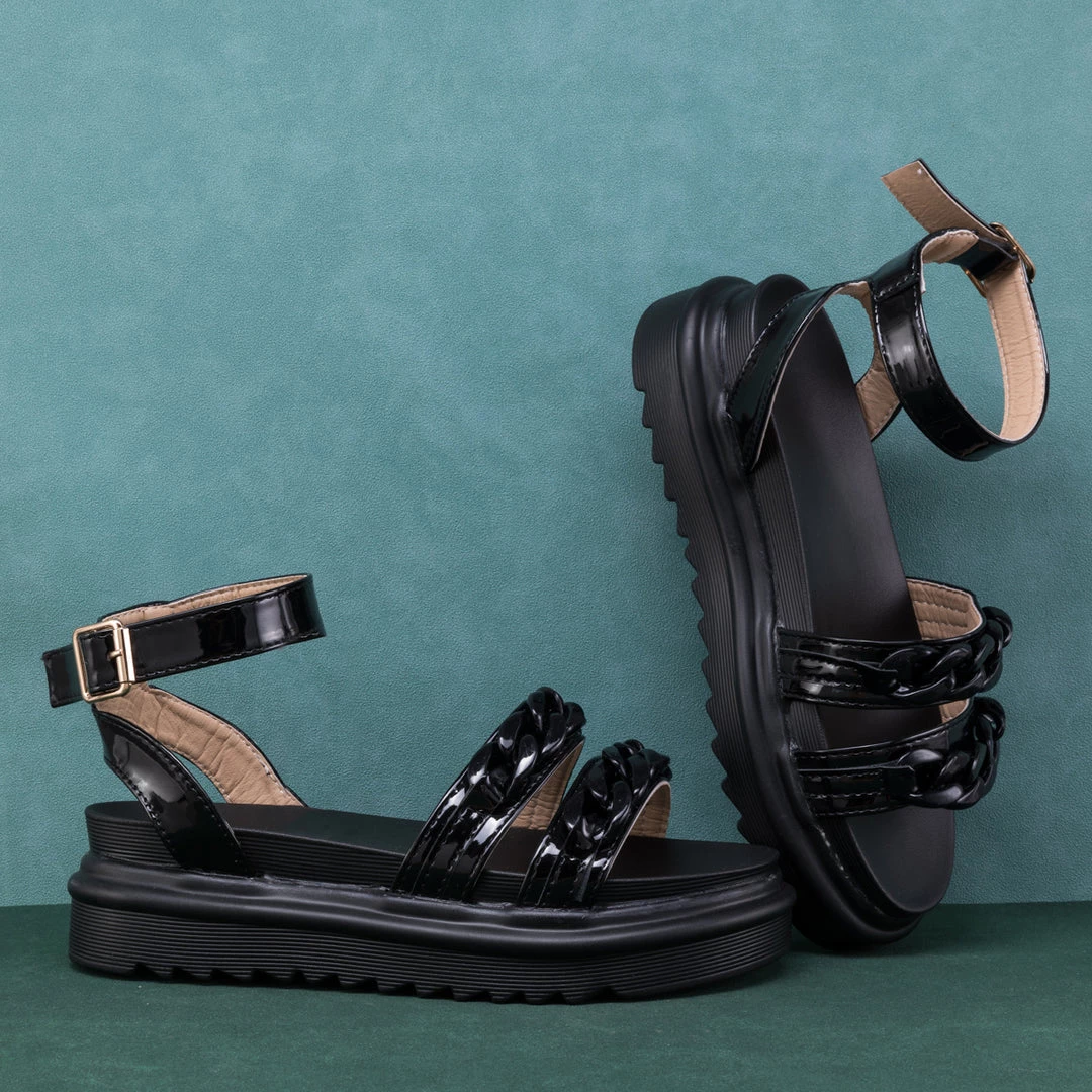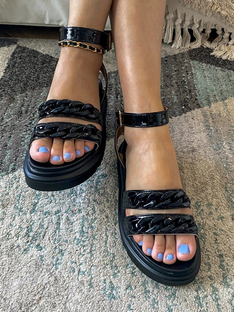 Showcase your fashion flair with these sandals featuring bold chains along the straps and a slight platform for all day comfort.