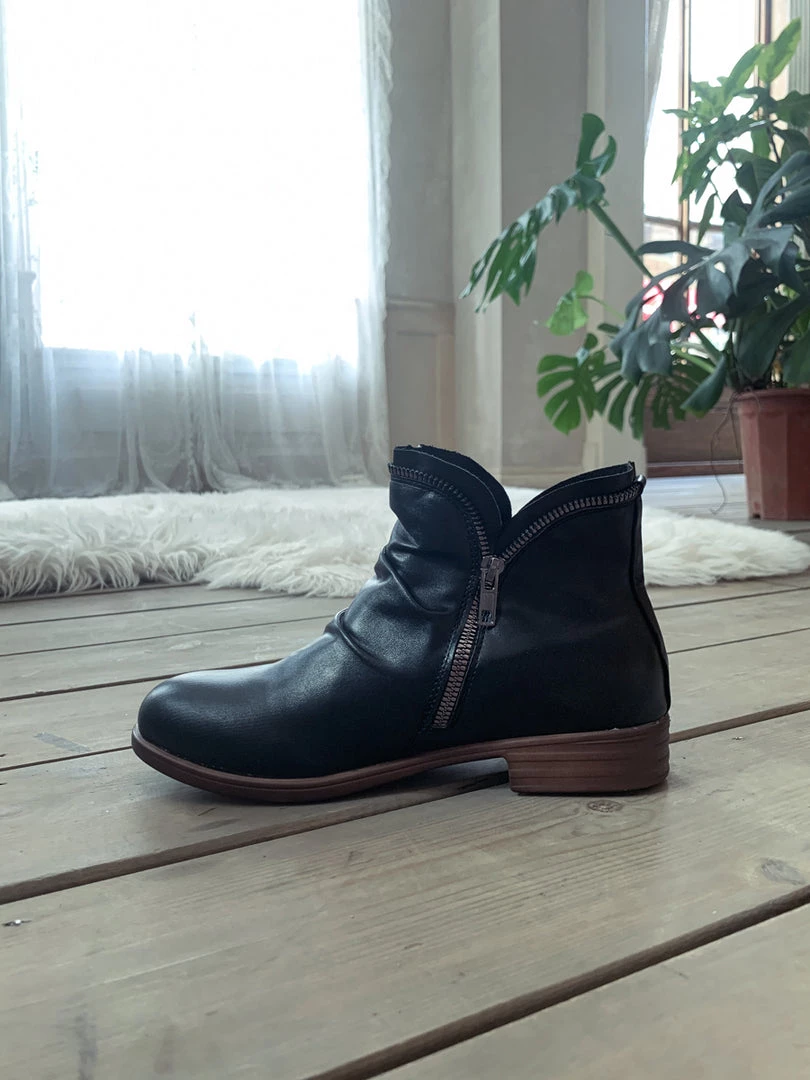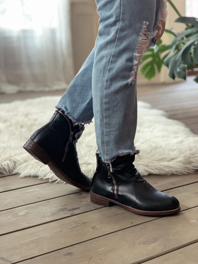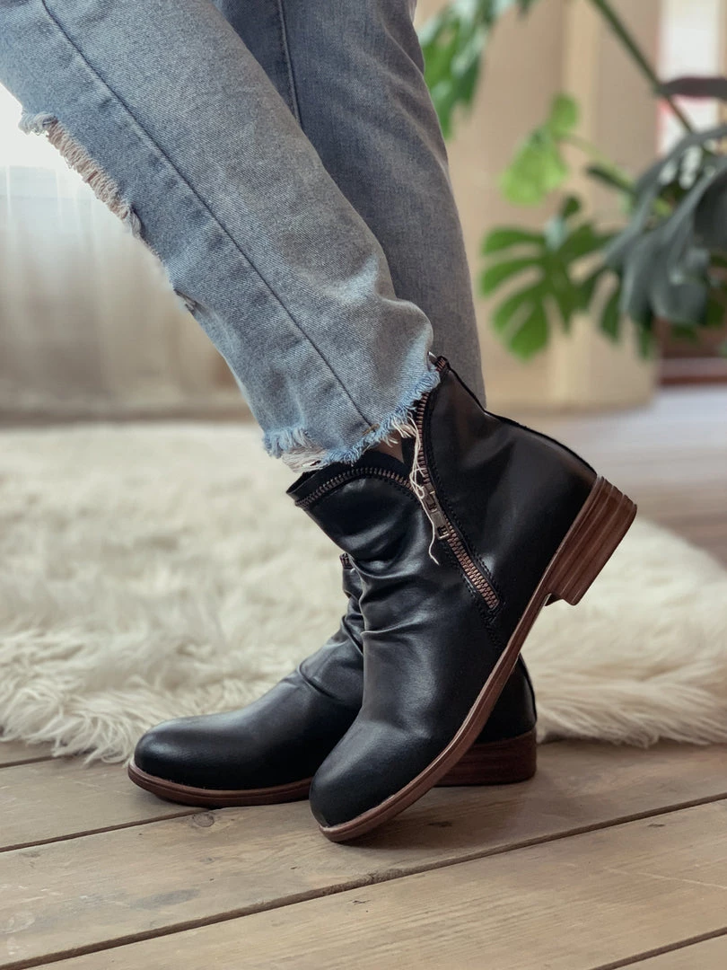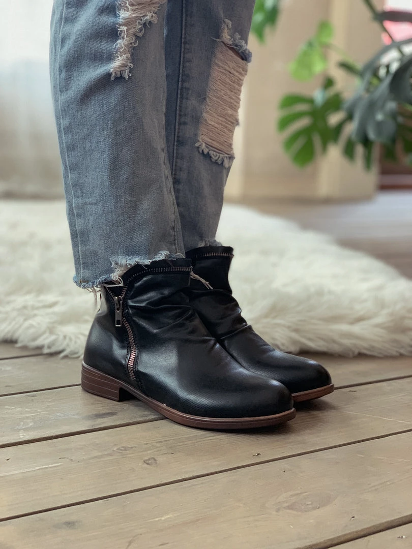 Complement just about any casual look with these ankle boots featuring a zip trim sew one the side.