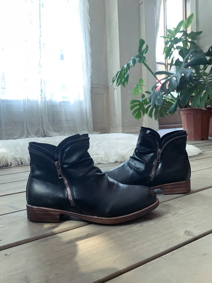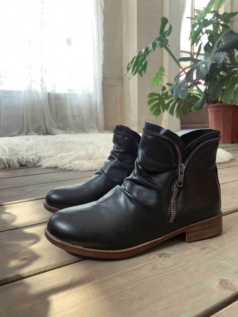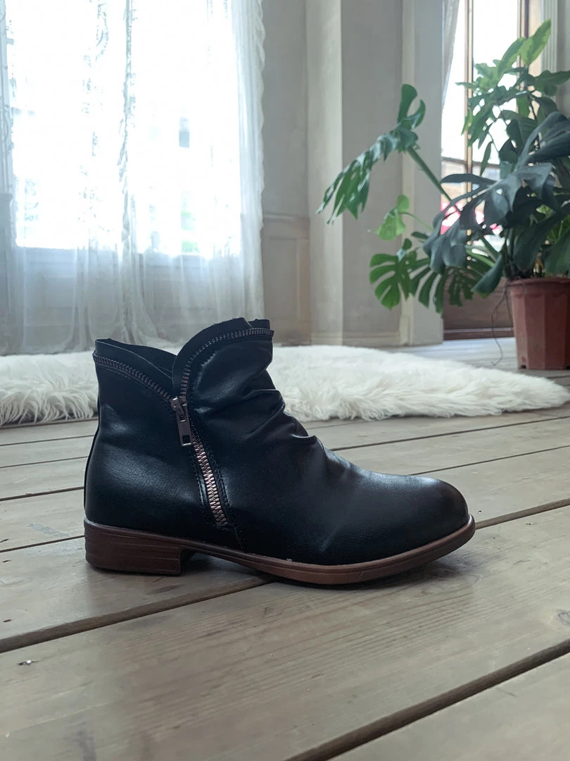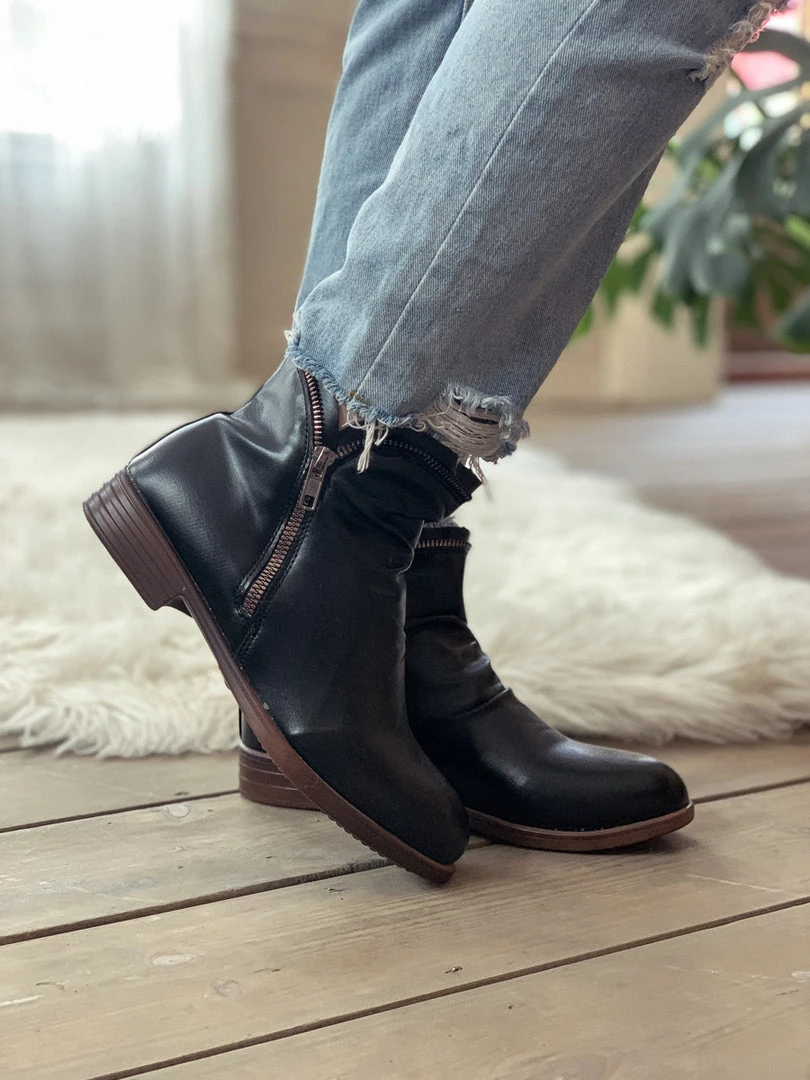 Complement just about any casual look with these ankle boots featuring a zip trim sew one the side.