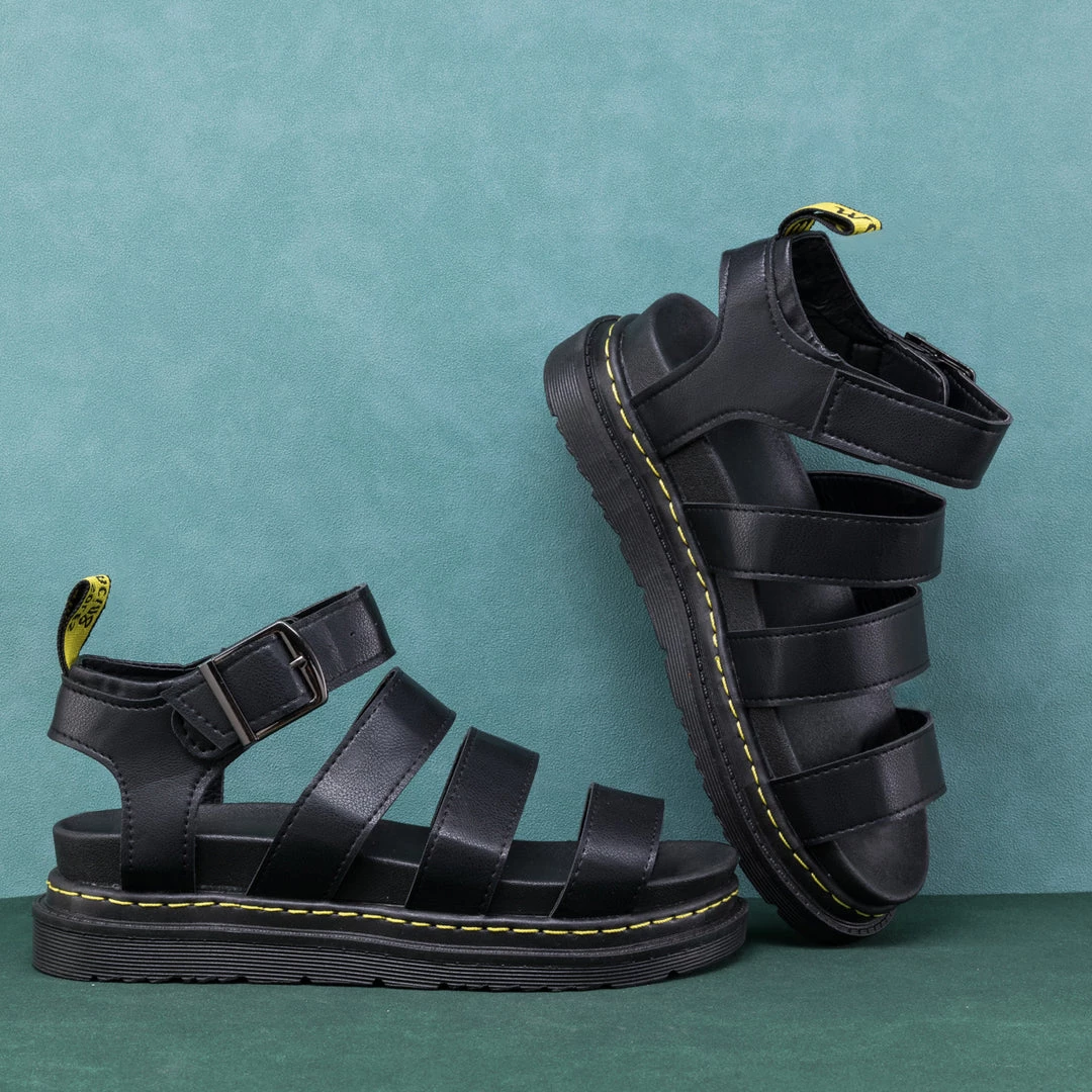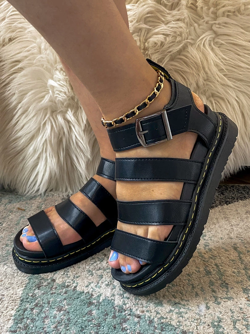 Step up sunny-day ensembles with these sleek sandals boasting a versatile solid hue and secure buckle closure.