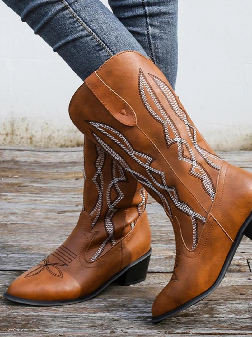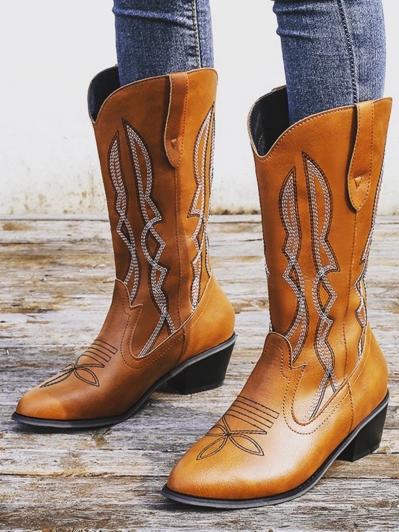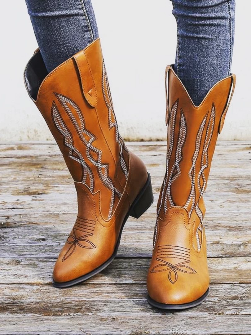 Slip on these elegant cowboy boots to infuse Southwestern-chic to your look. Low heels and detailed geometry embroidery add a boho looking.