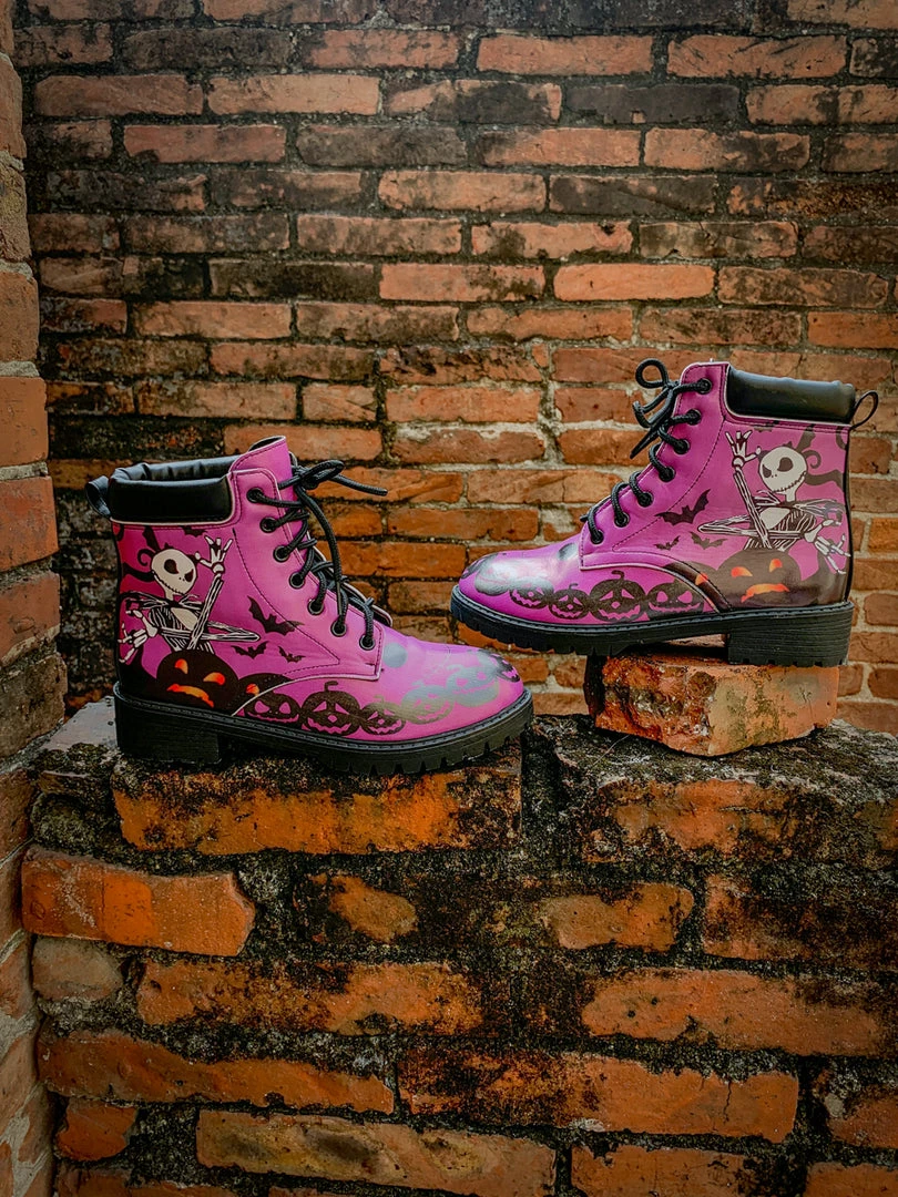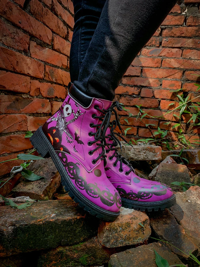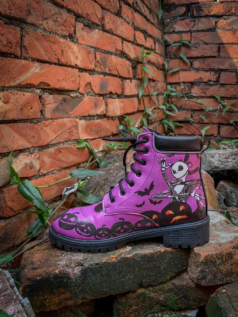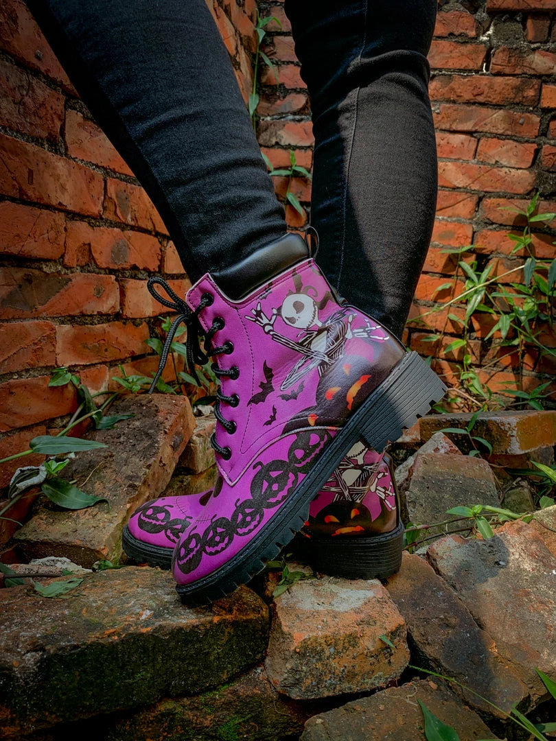 Edge up your style with these statement combat boots designed with a halloween characters print that offers a holiday feminine flair.