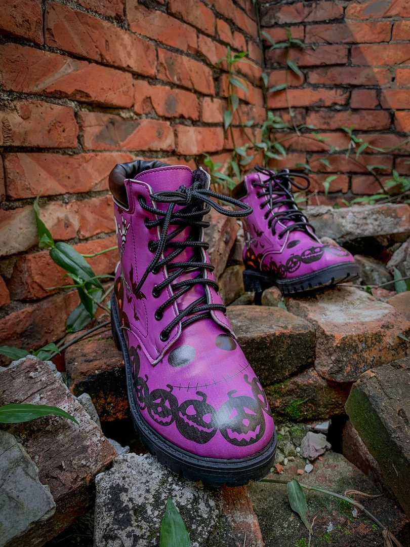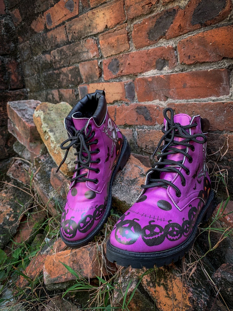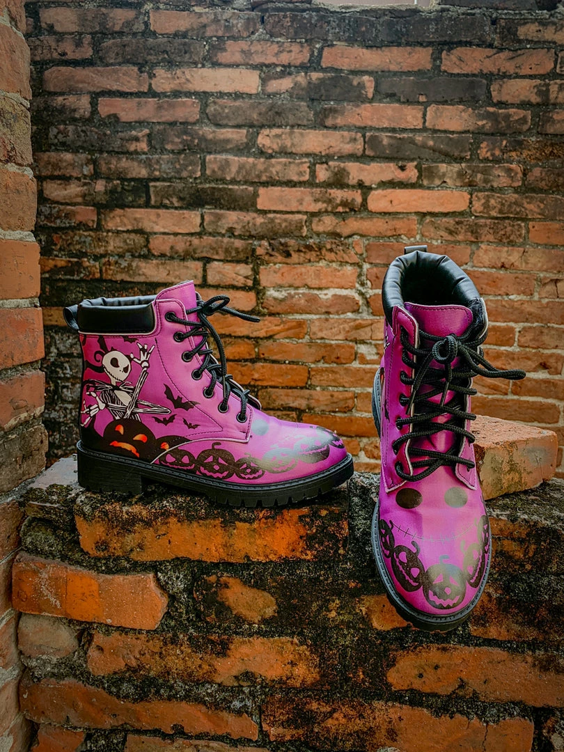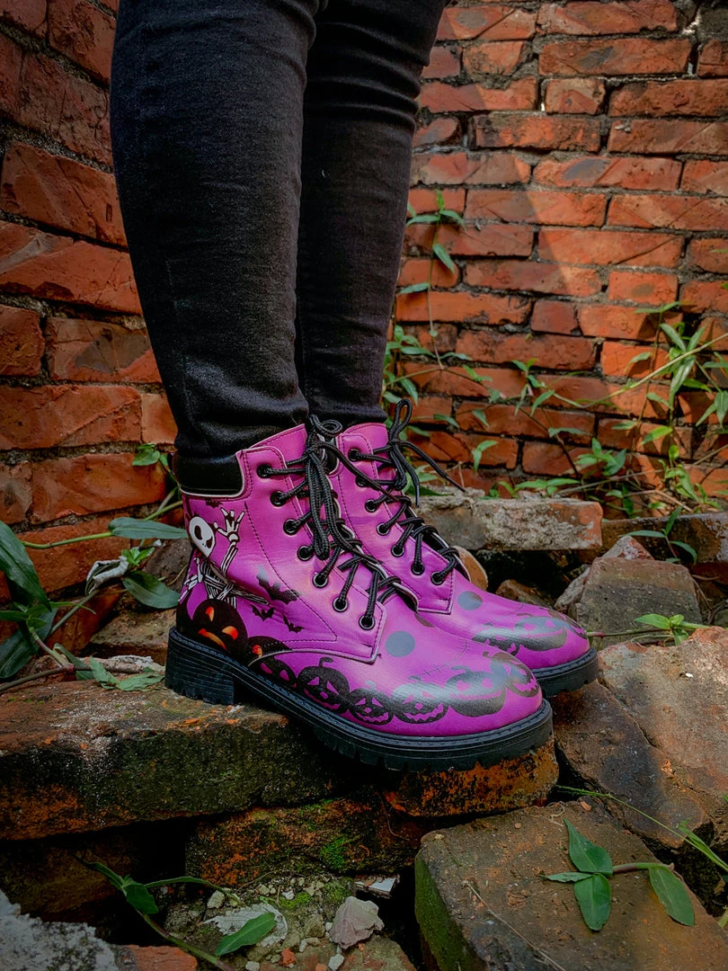 Edge up your style with these statement combat boots designed with a halloween characters print that offers a holiday feminine flair.