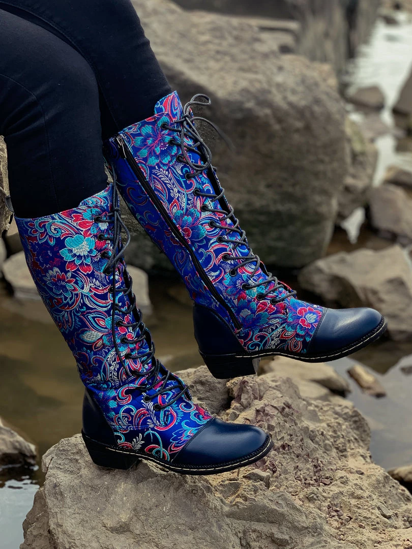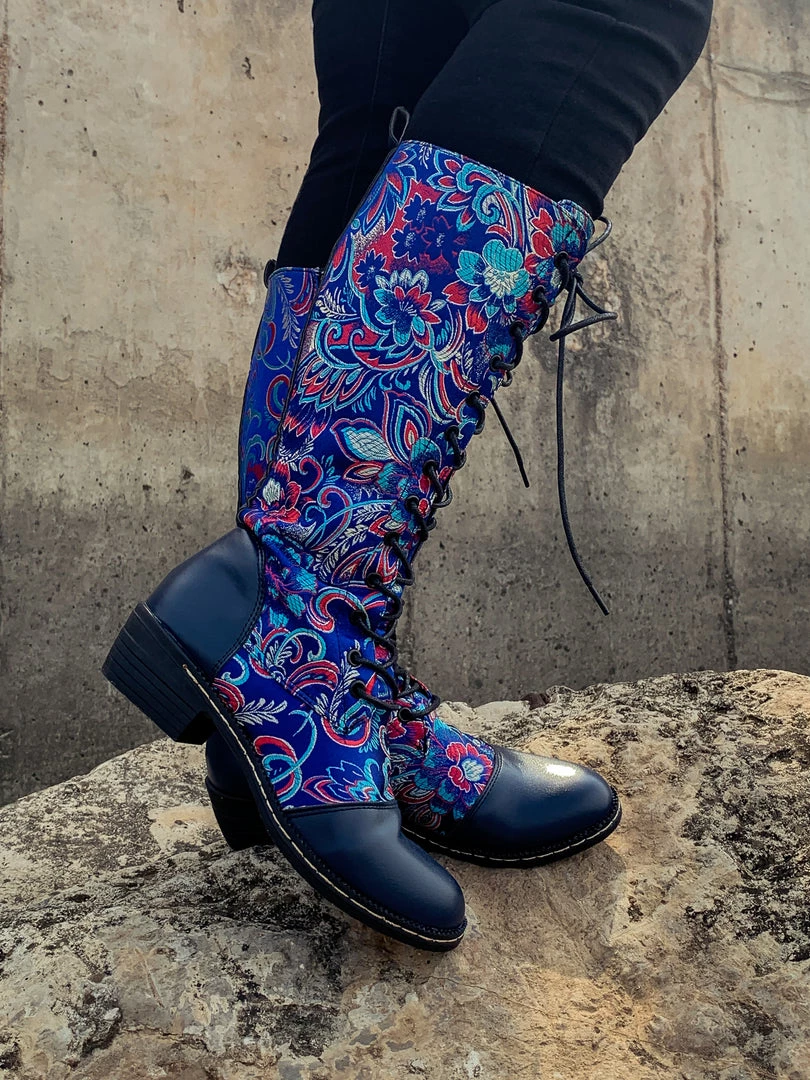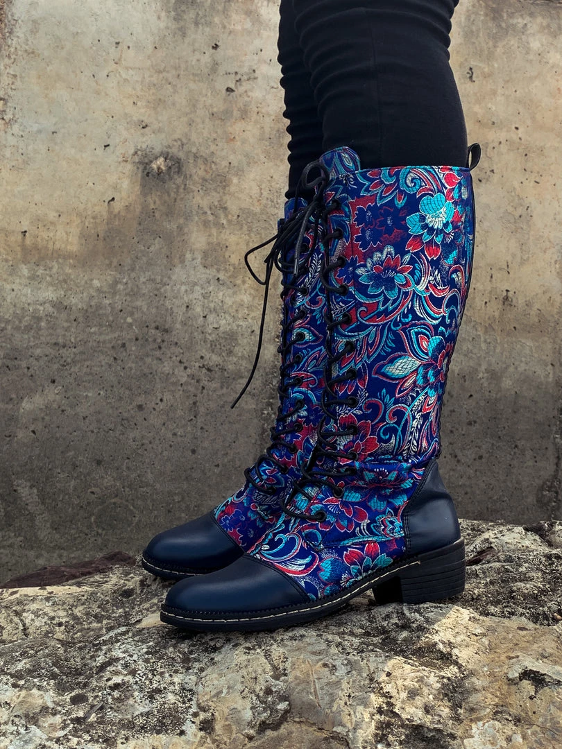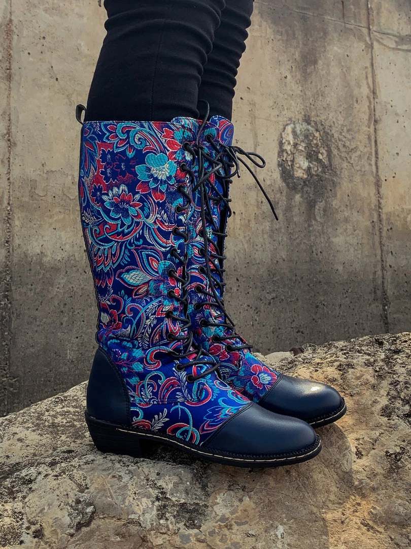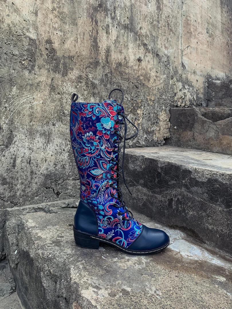 Show off your playful personality with these stylish leather high-boots boasting a vibrant floral design for a boho-chic finish.