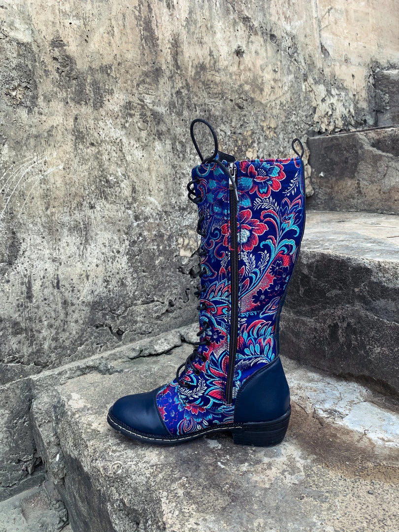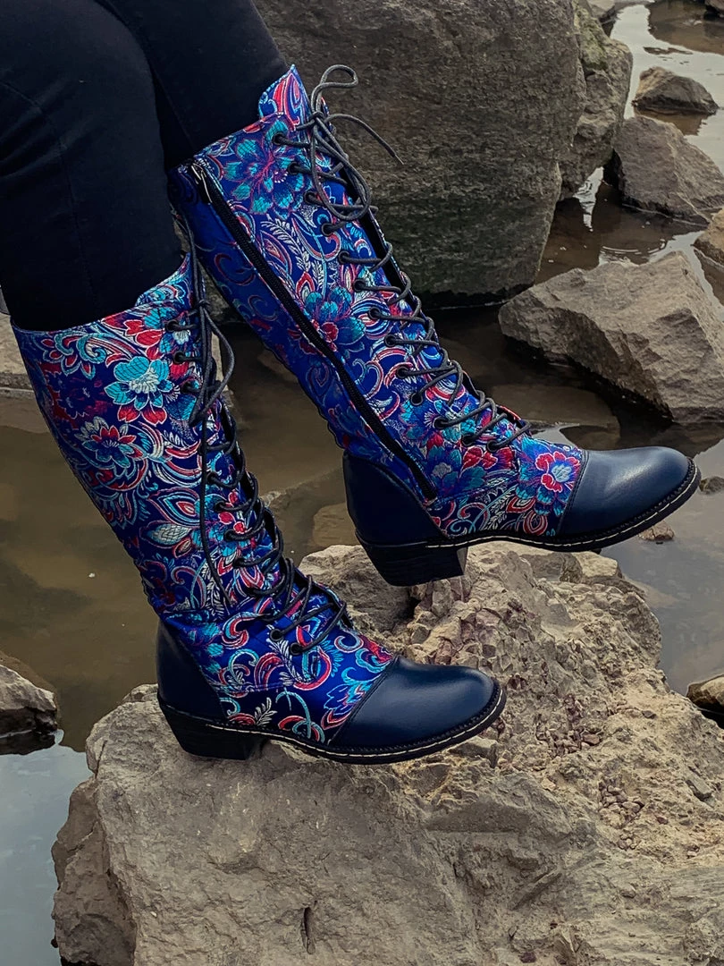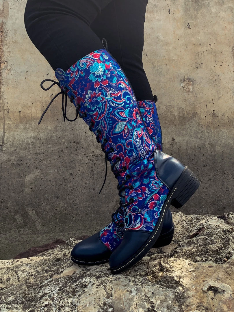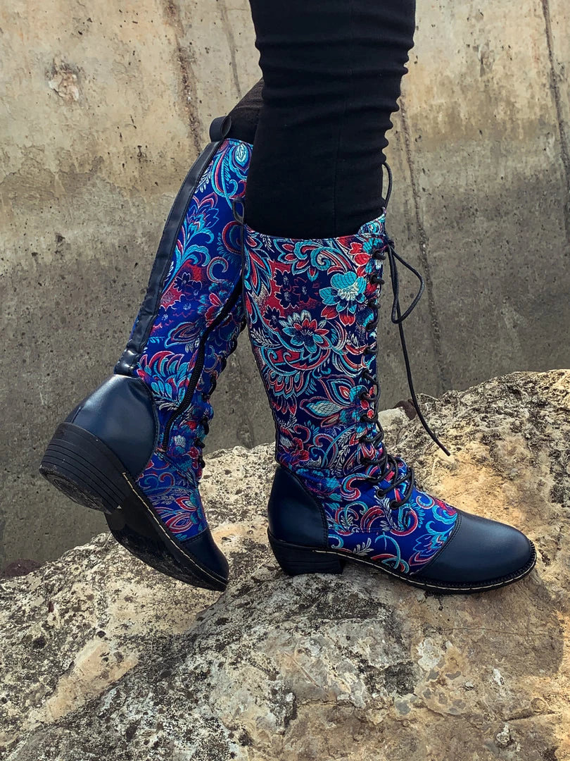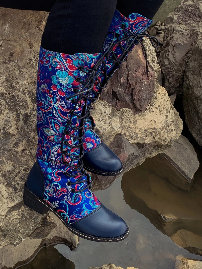 Show off your playful personality with these stylish leather high-boots boasting a vibrant floral design for a boho-chic finish.