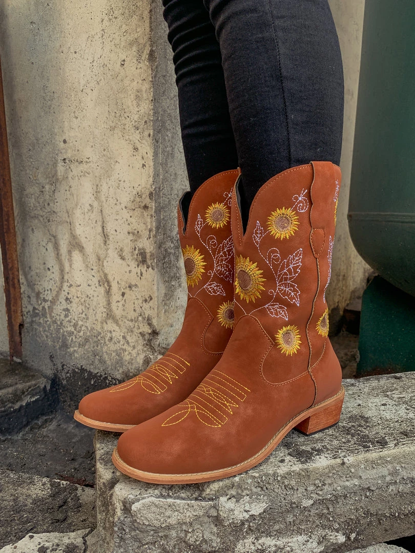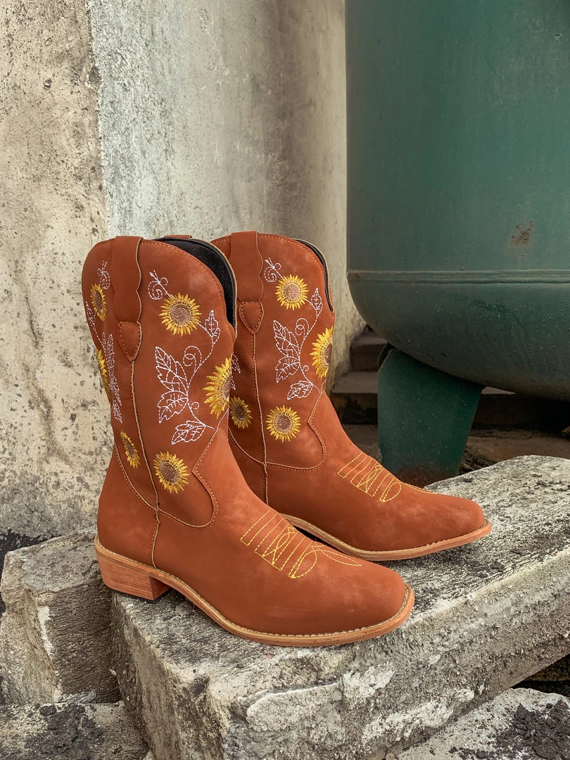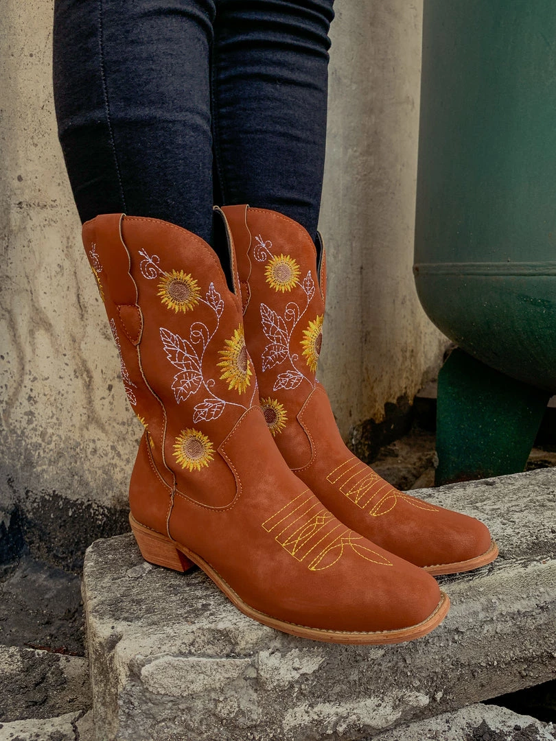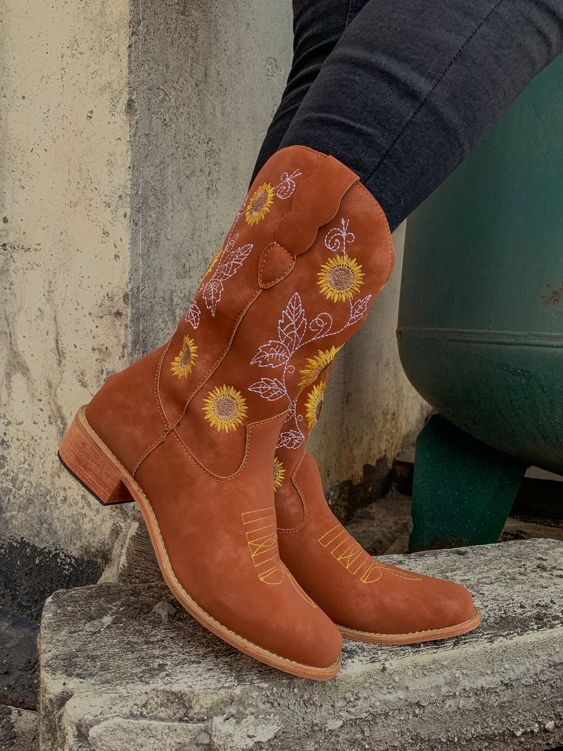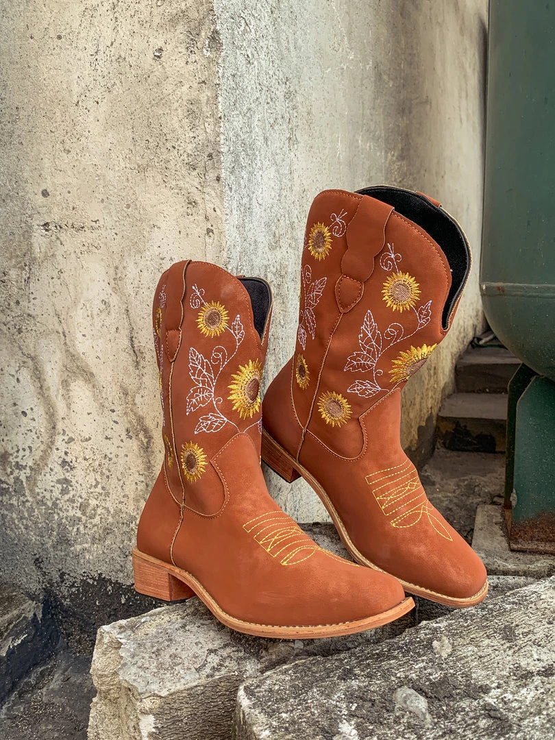 Spruce up your footwear collection with this western-style cowboy boot that boasts a charming embroidered sunflower design.