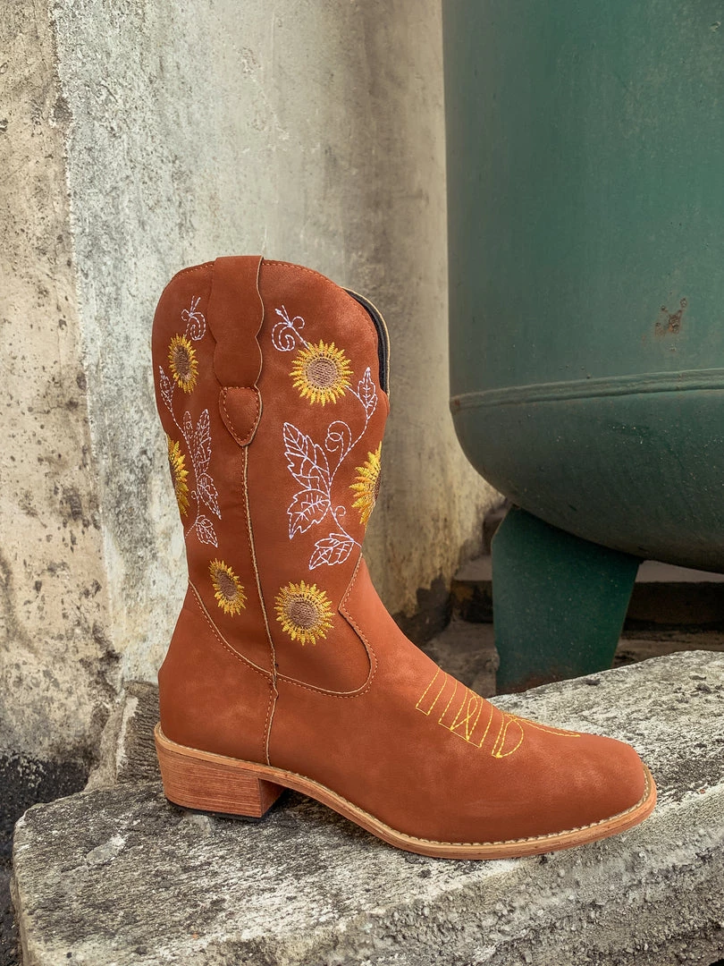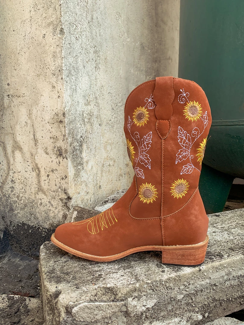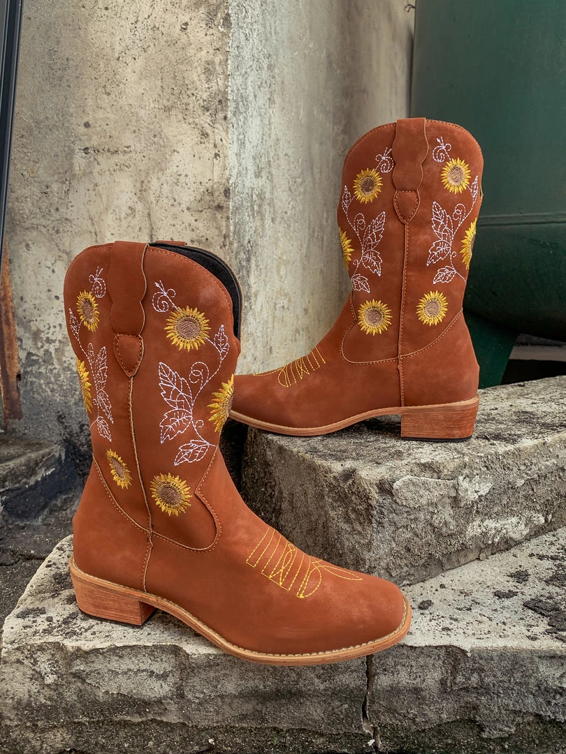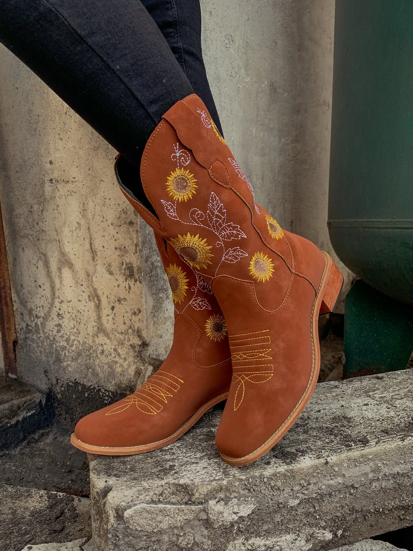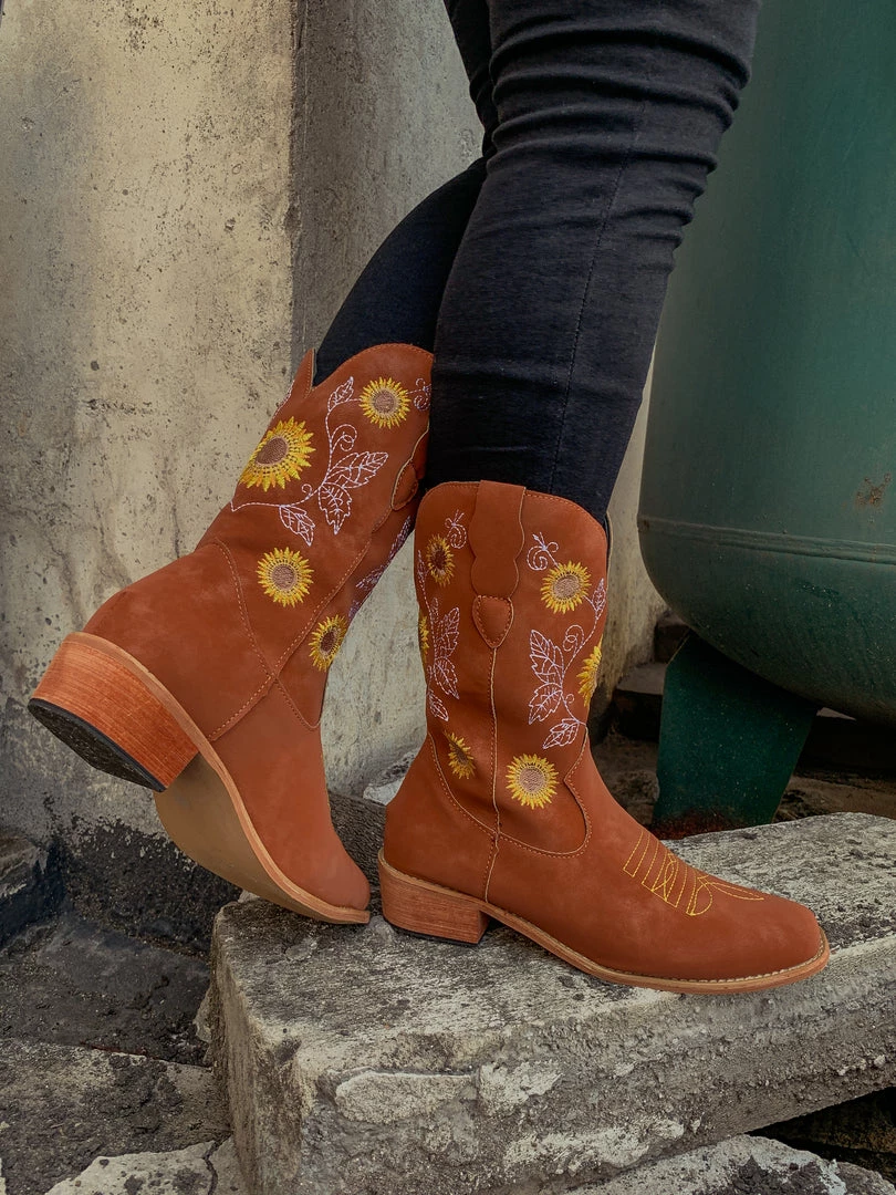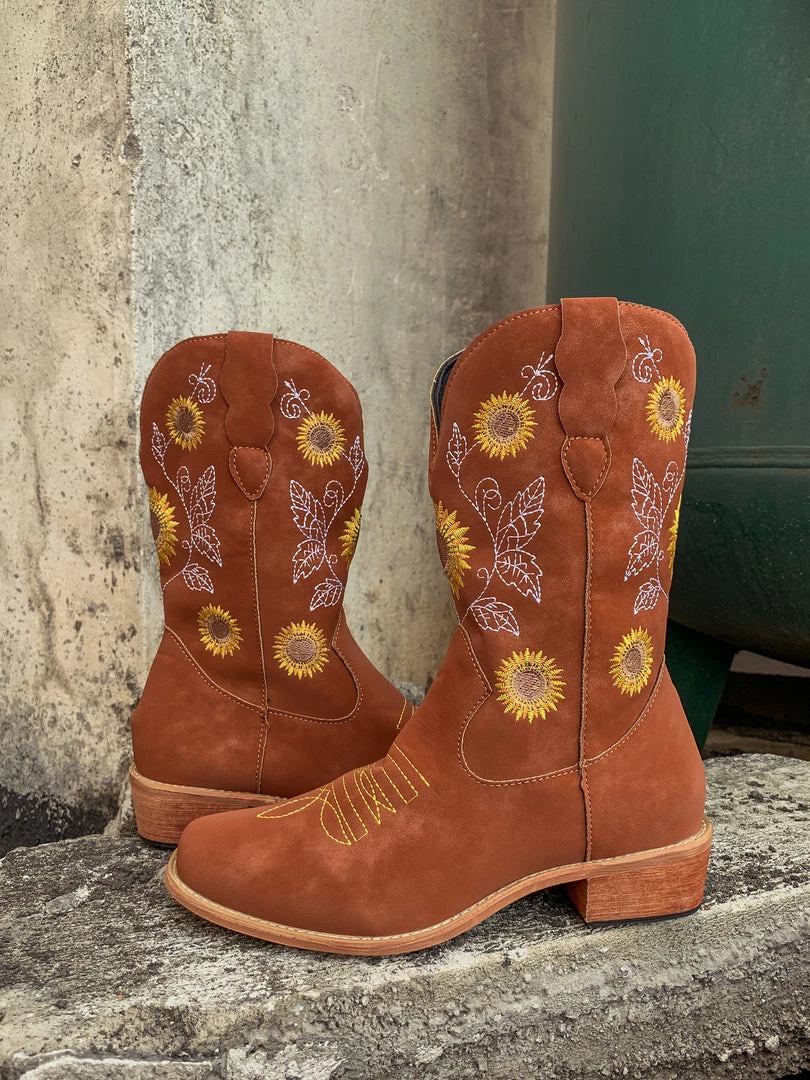 Spruce up your footwear collection with this western-style cowboy boot that boasts a charming embroidered sunflower design.