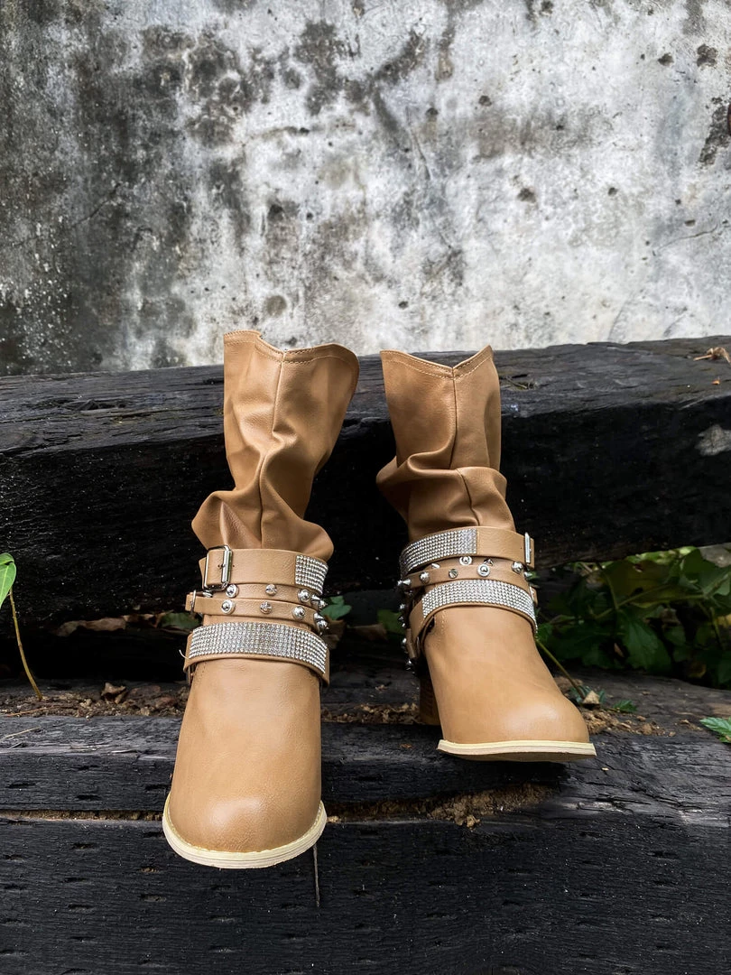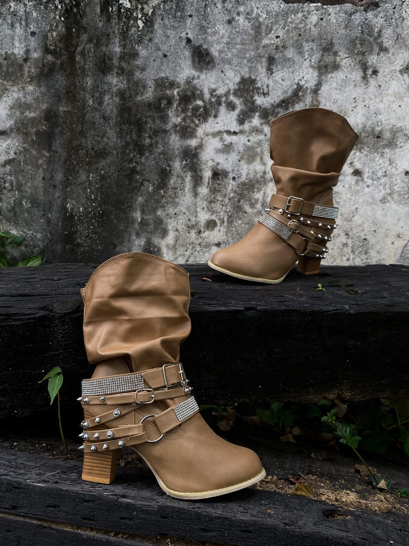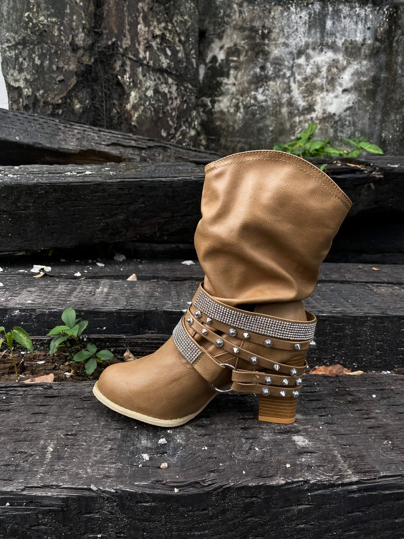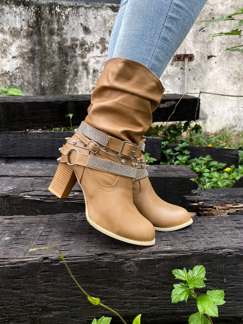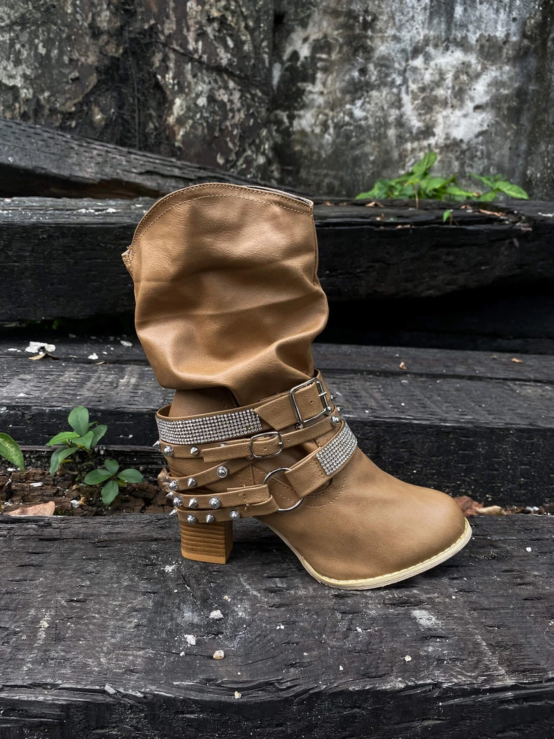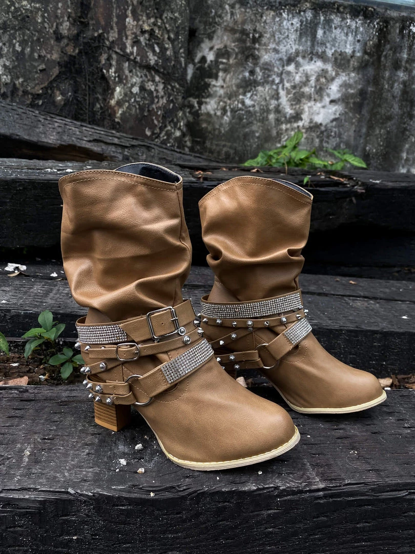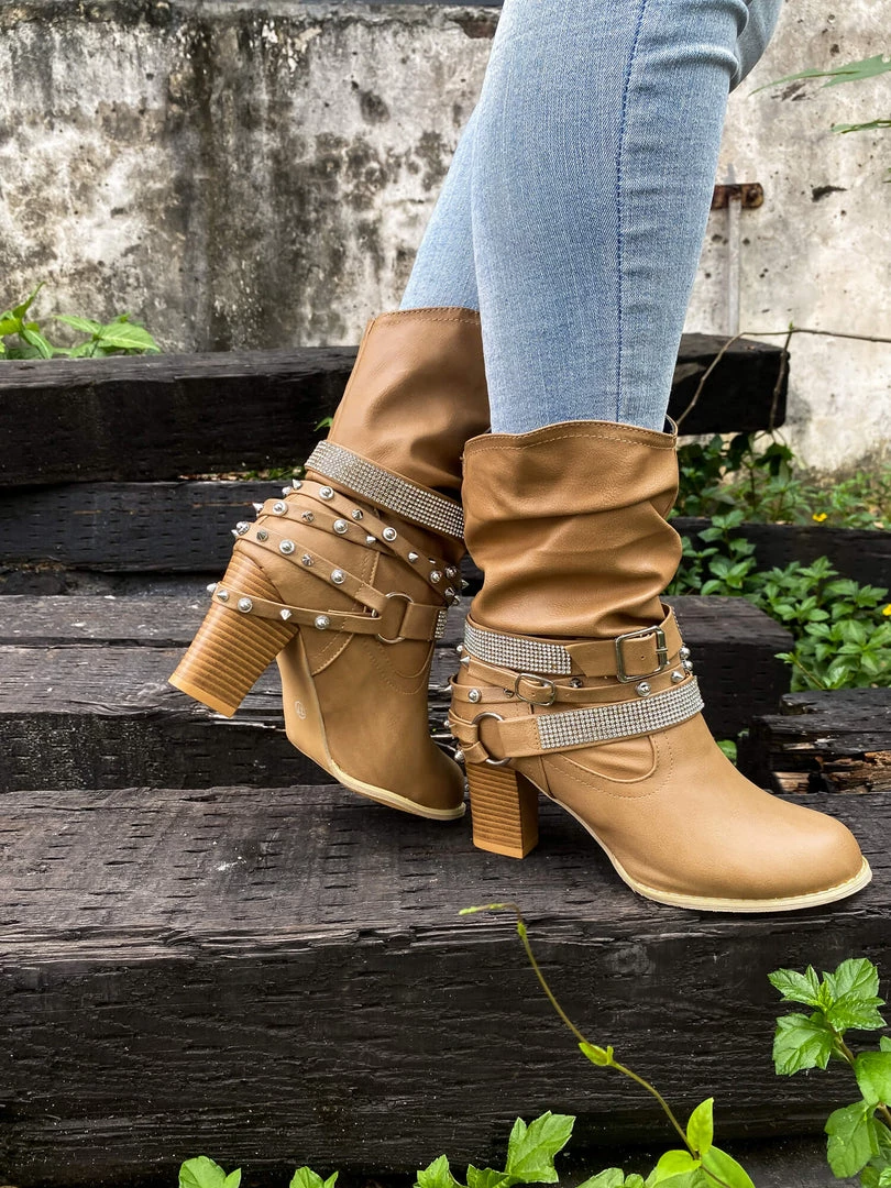 Add a dash of bohemian attitude to your strides when you step out in these relaxed boots featuring strap-wrapped design. The block heel adds a boost of flattering height while the skid-resistant sole keeps you secure.