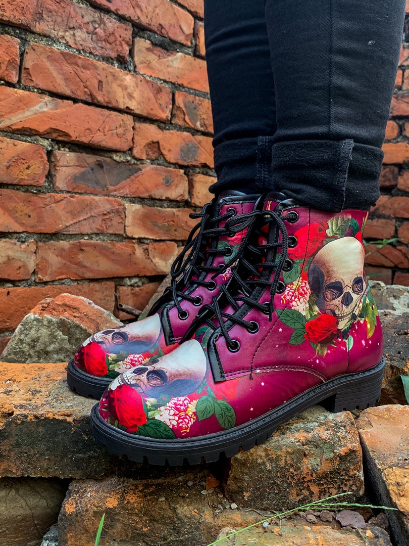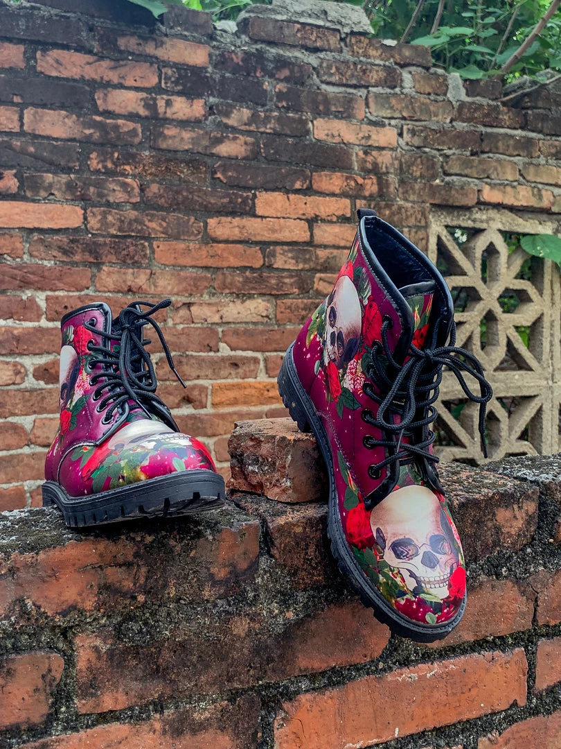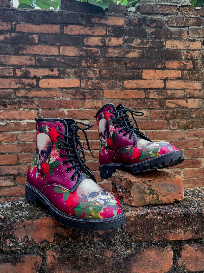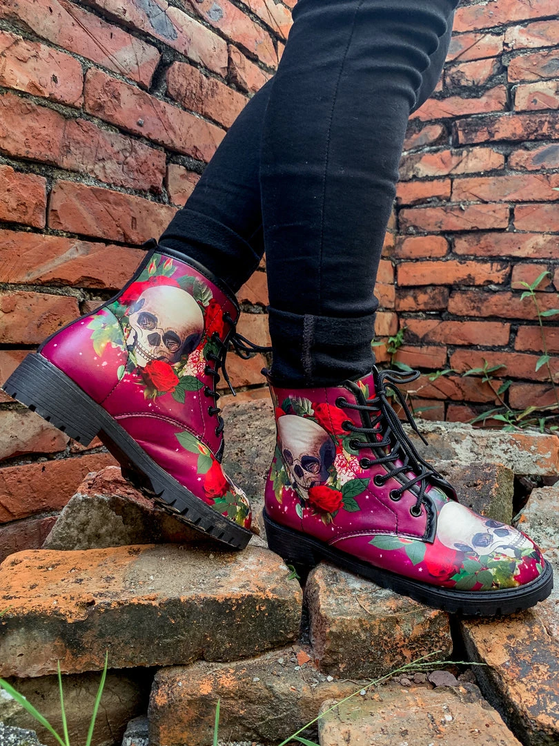 Edge up your style with these statement combat boots designed with a rose print that offers a feminine flair vs rock & roll spirit.