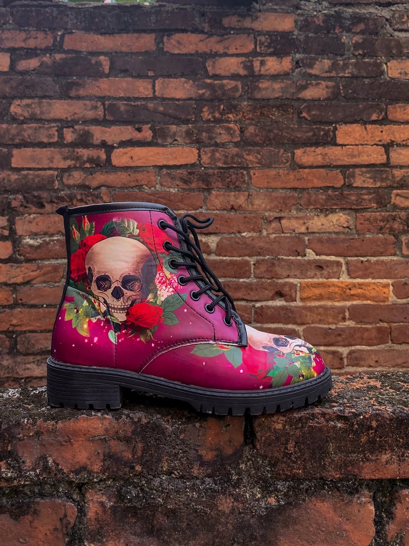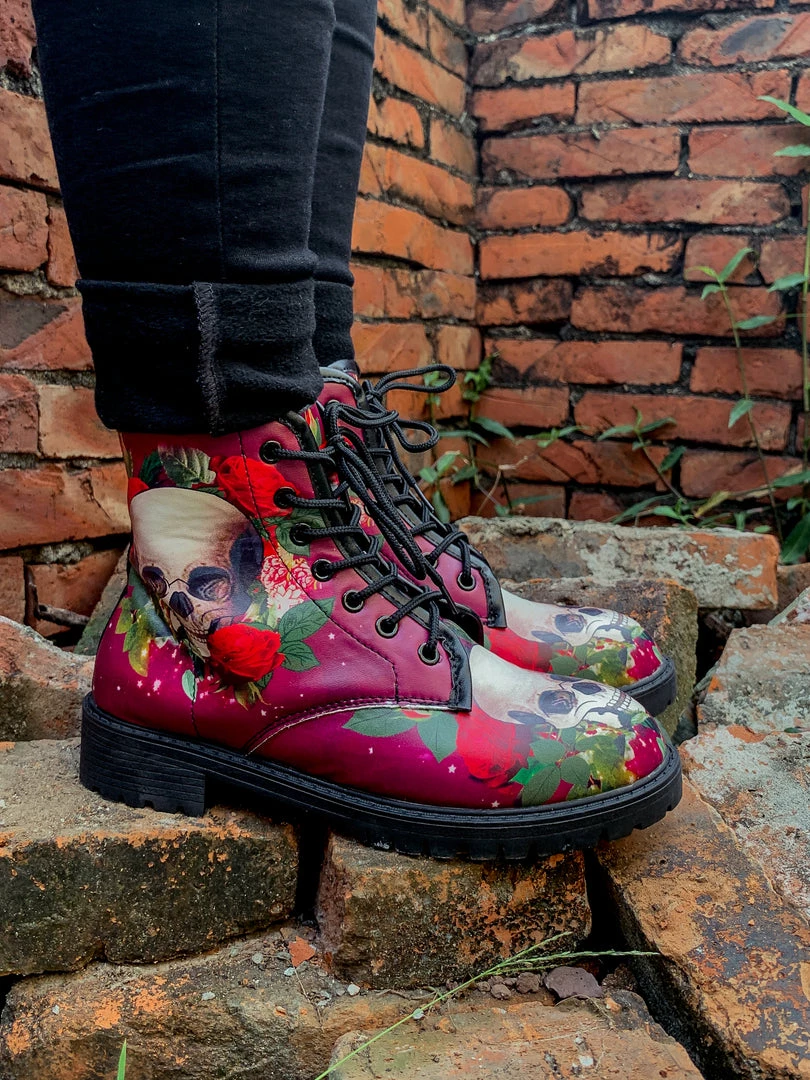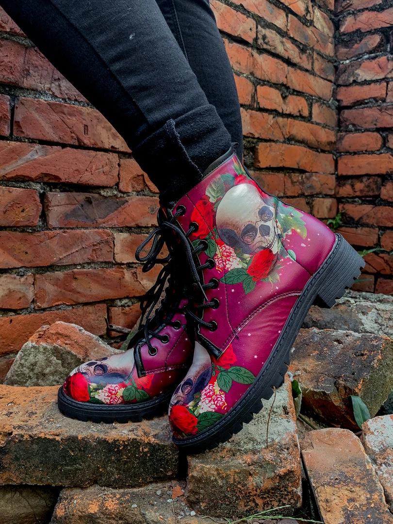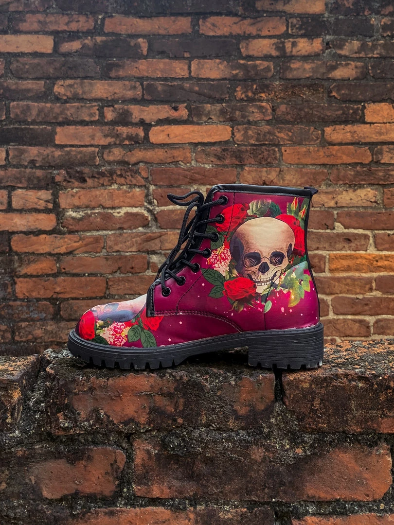 Edge up your style with these statement combat boots designed with a rose print that offers a feminine flair vs rock & roll spirit.