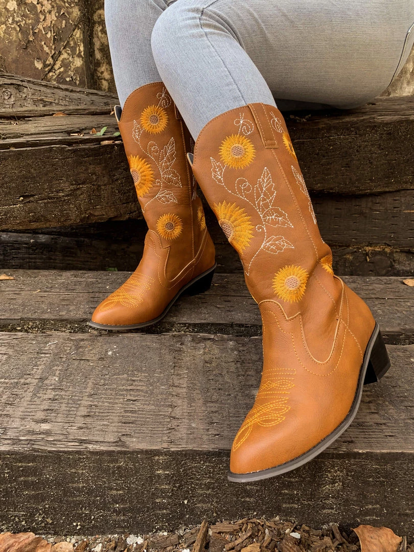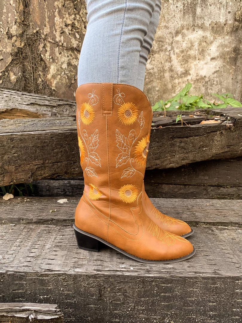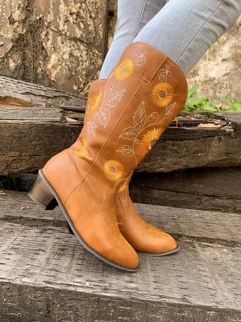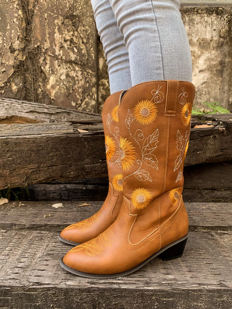 Send your ensemble in a wild west direction with this bold cowboy boot featuring a low, walkable heel and blooming embroidery.