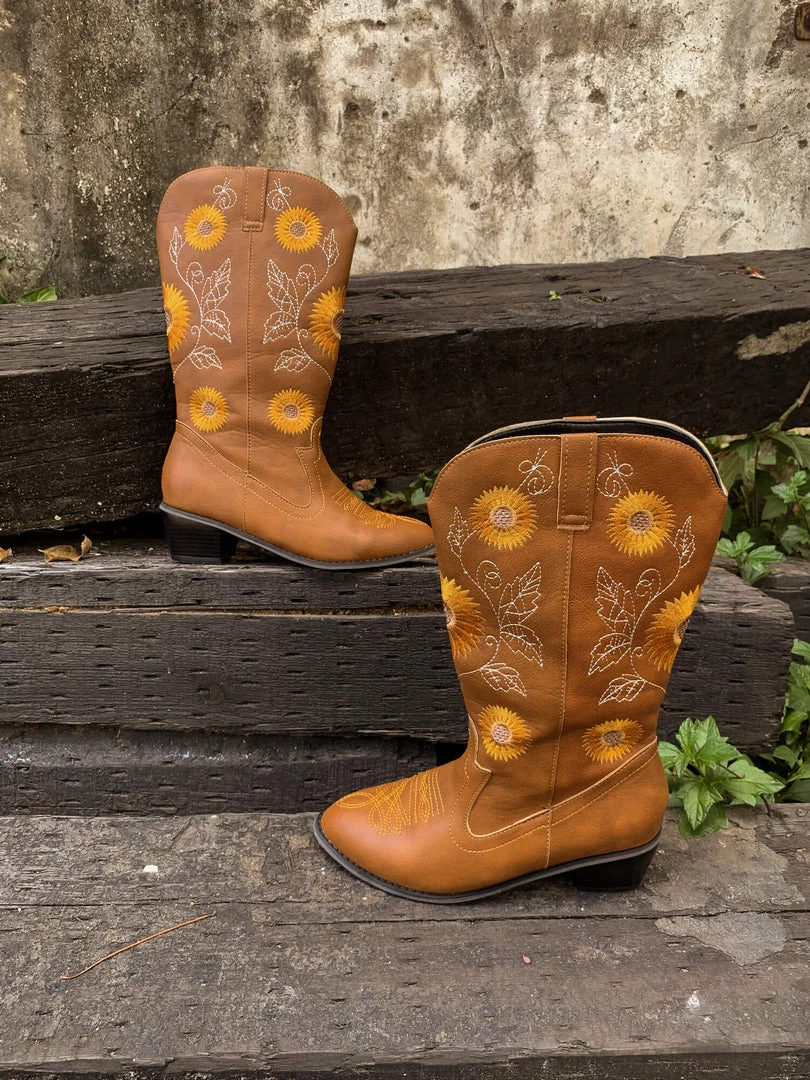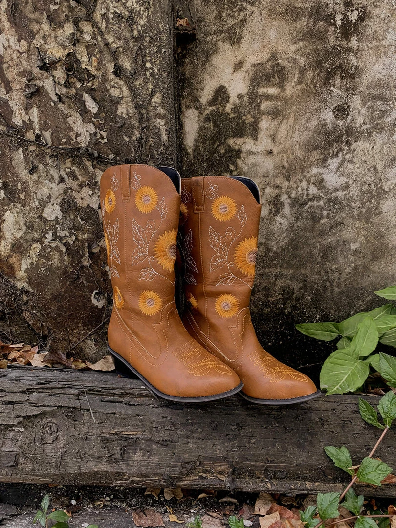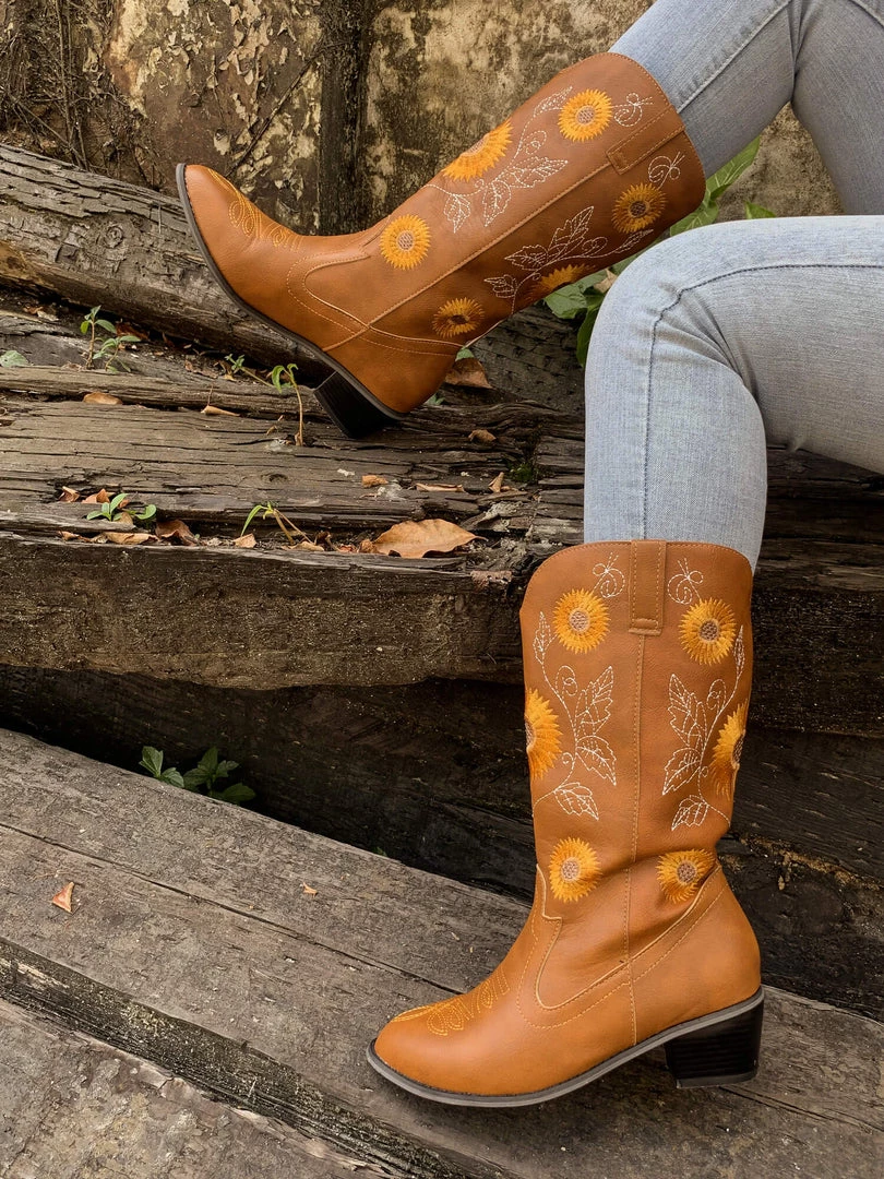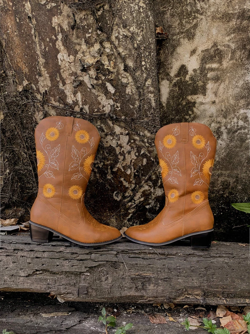 Send your ensemble in a wild west direction with this bold cowboy boot featuring a low, walkable heel and blooming embroidery.