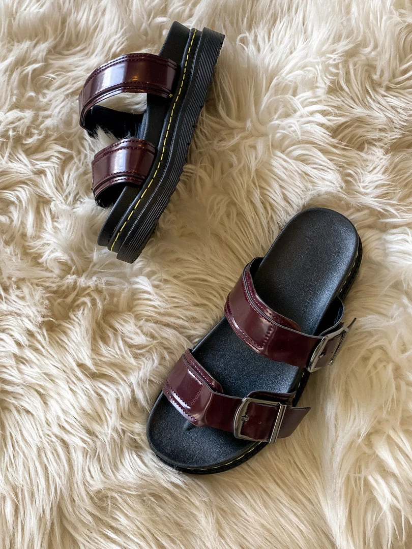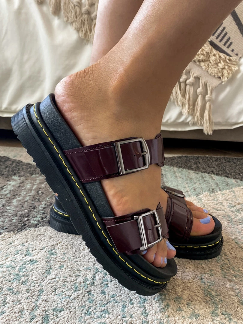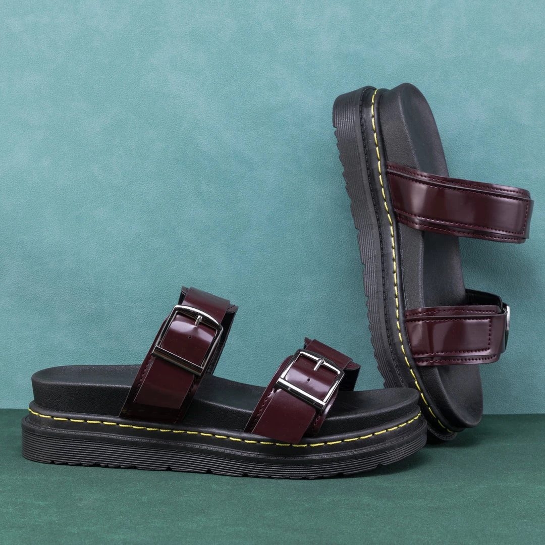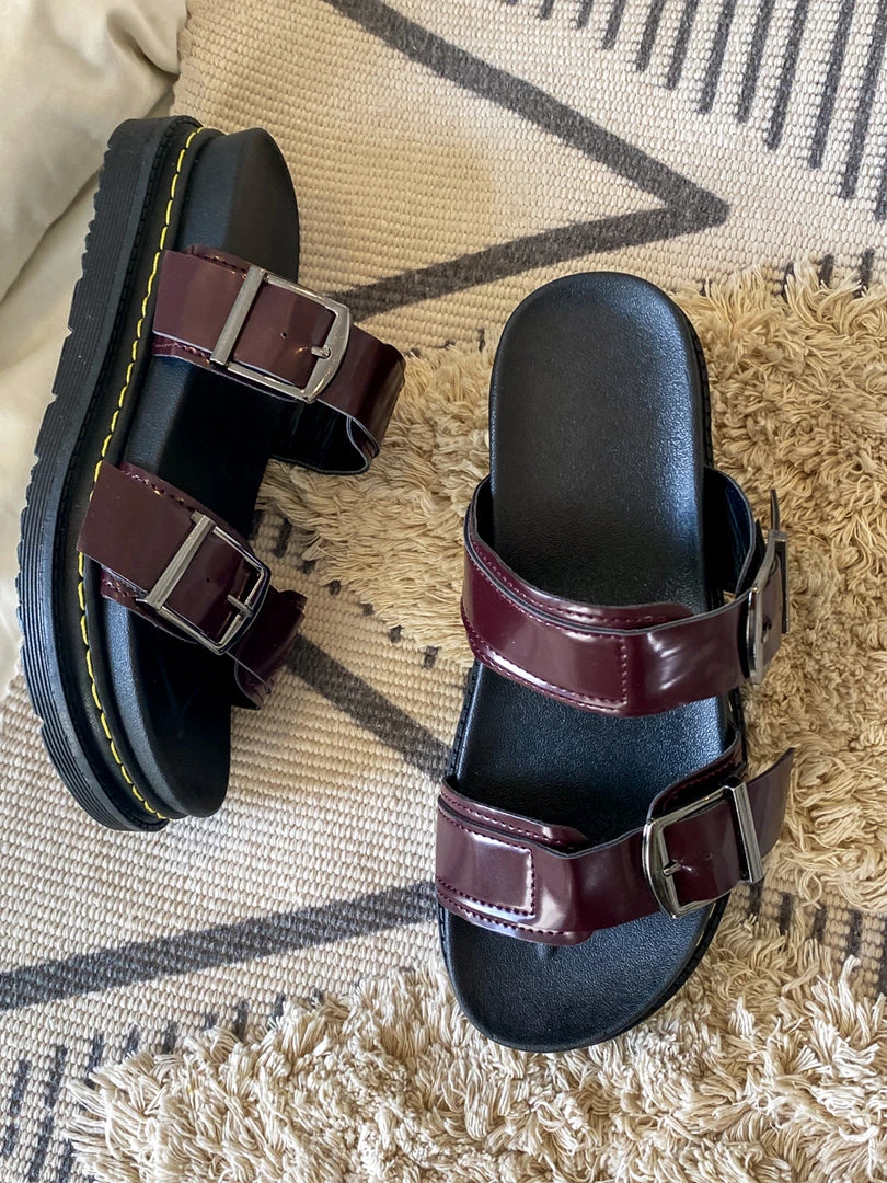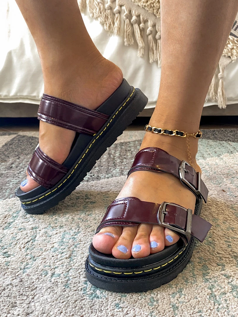 Step up sunny-day ensembles with these sleek sandals boasting a versatile solid hue and secure buckle closure.