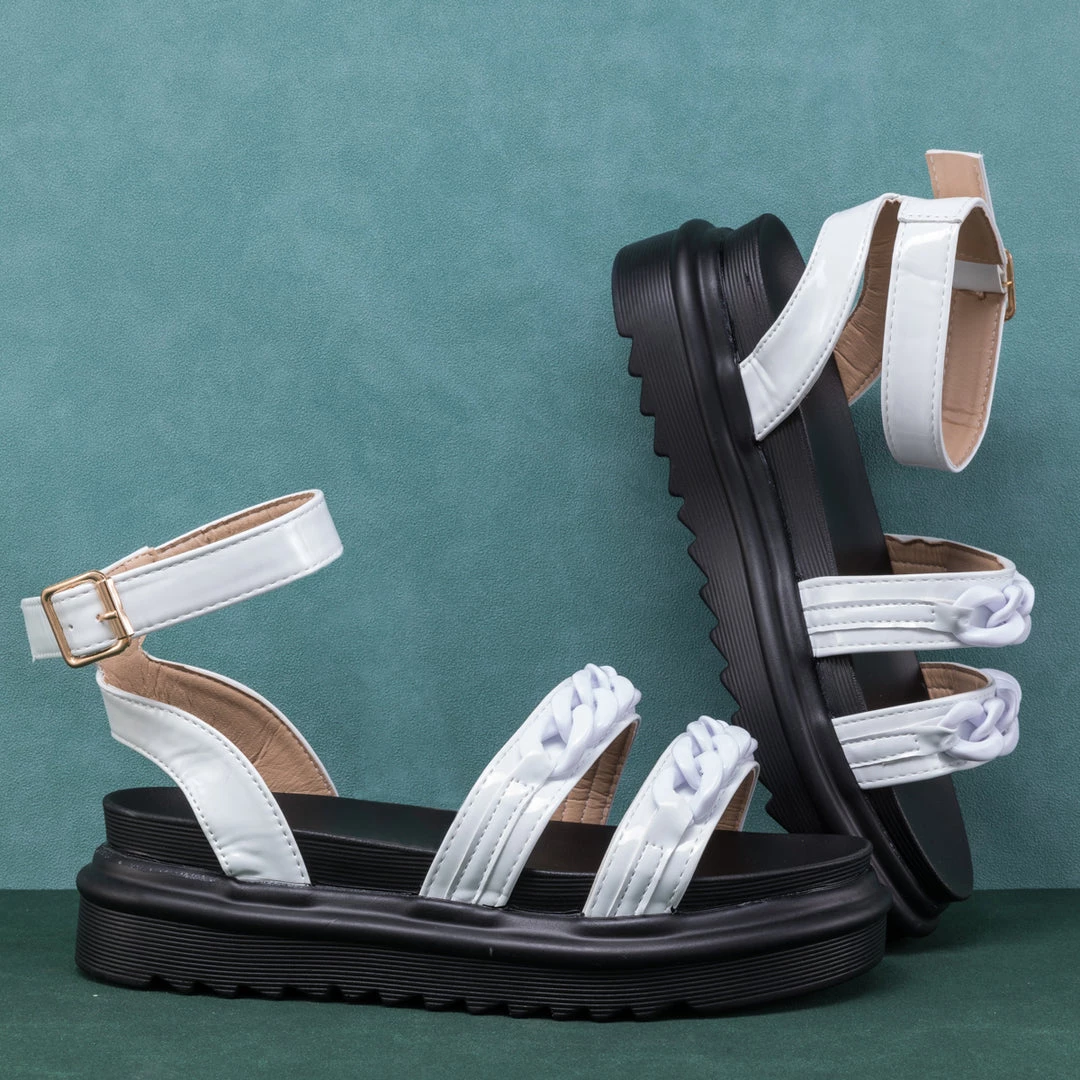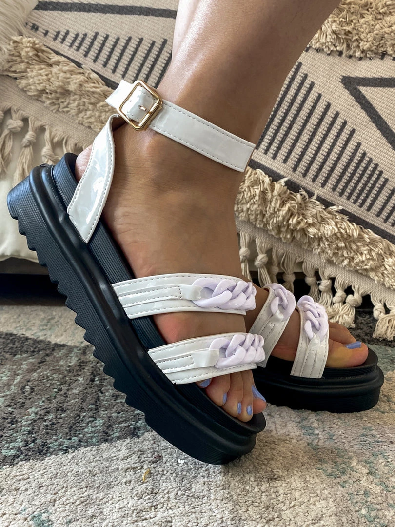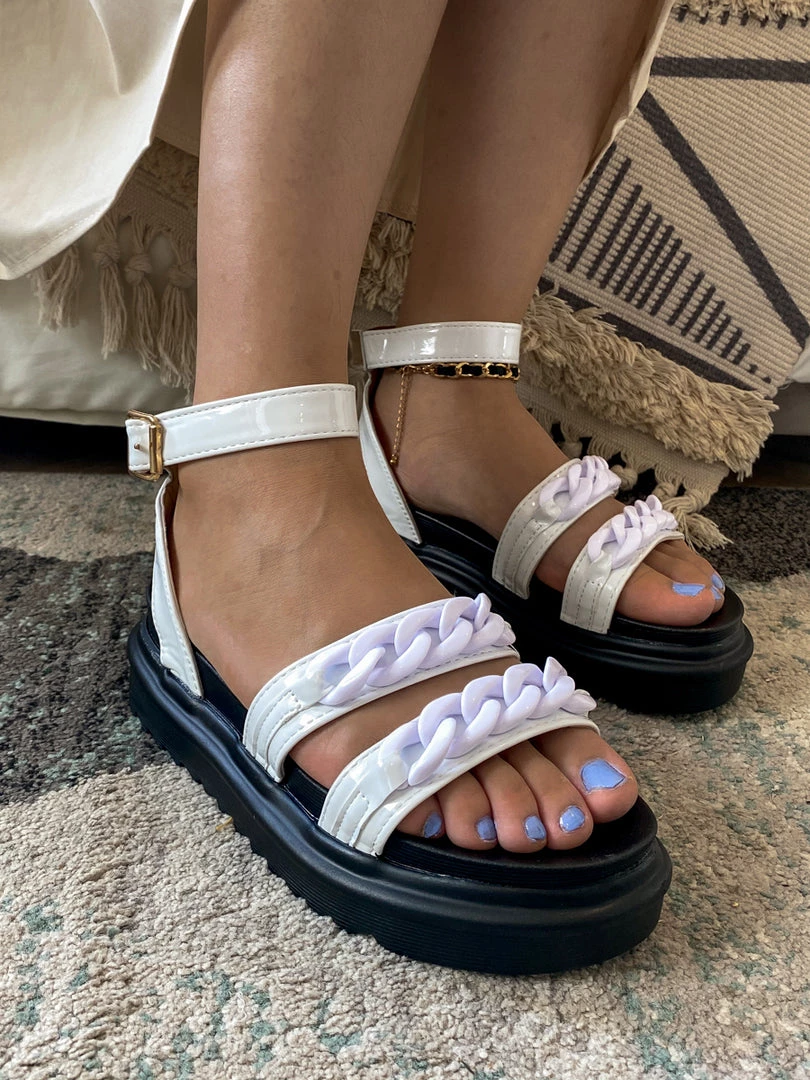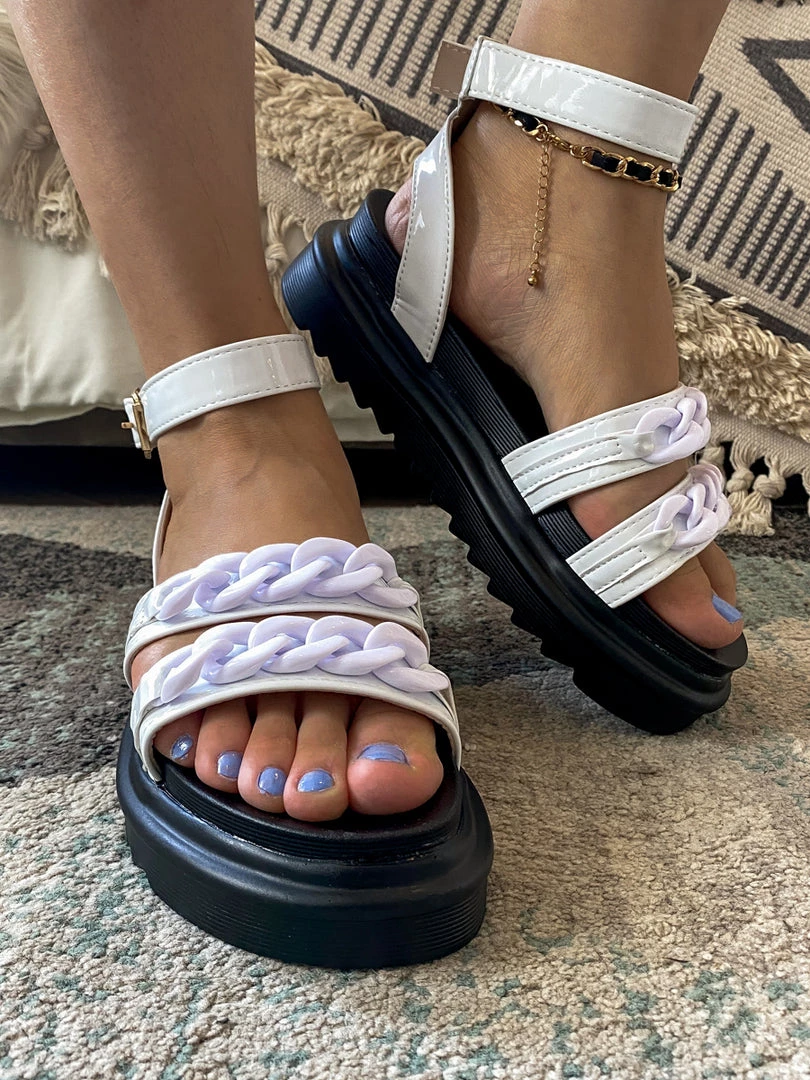 Showcase your fashion flair with these sandals featuring bold chains along the straps and a slight platform for all day comfort.