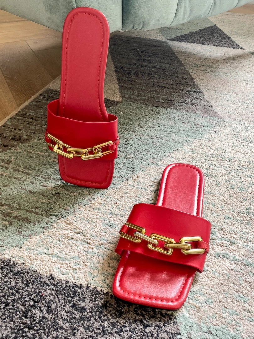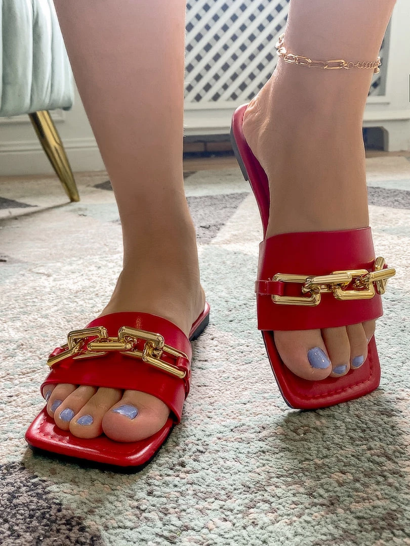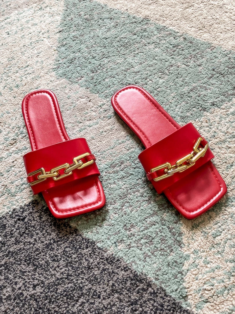 Pretty up your feet by slipping on this slide that flaunts a wide single band accented by a gleaming chain detail. A slip-fighting rubber sole makes for surer steps.