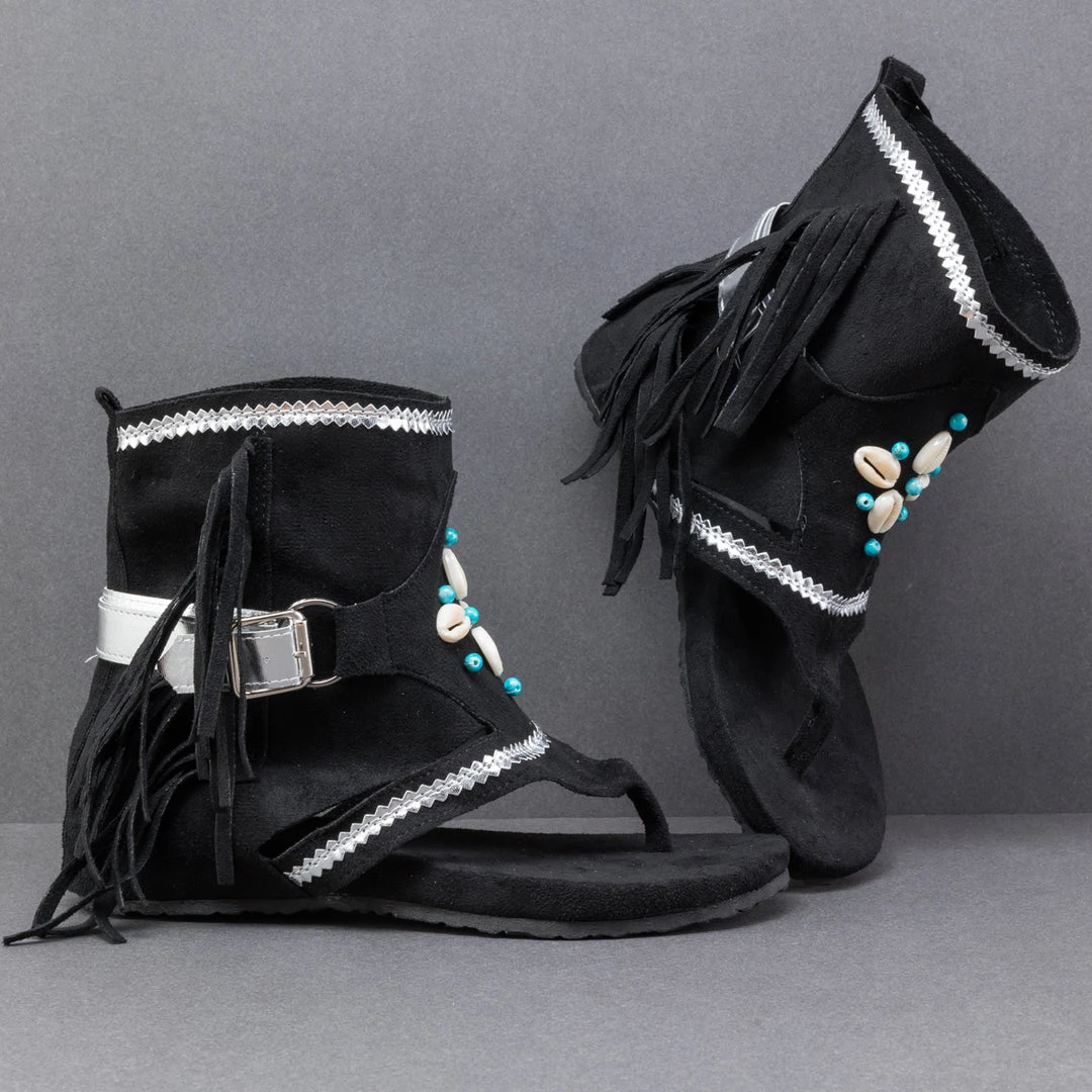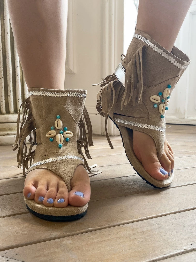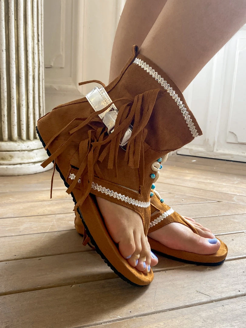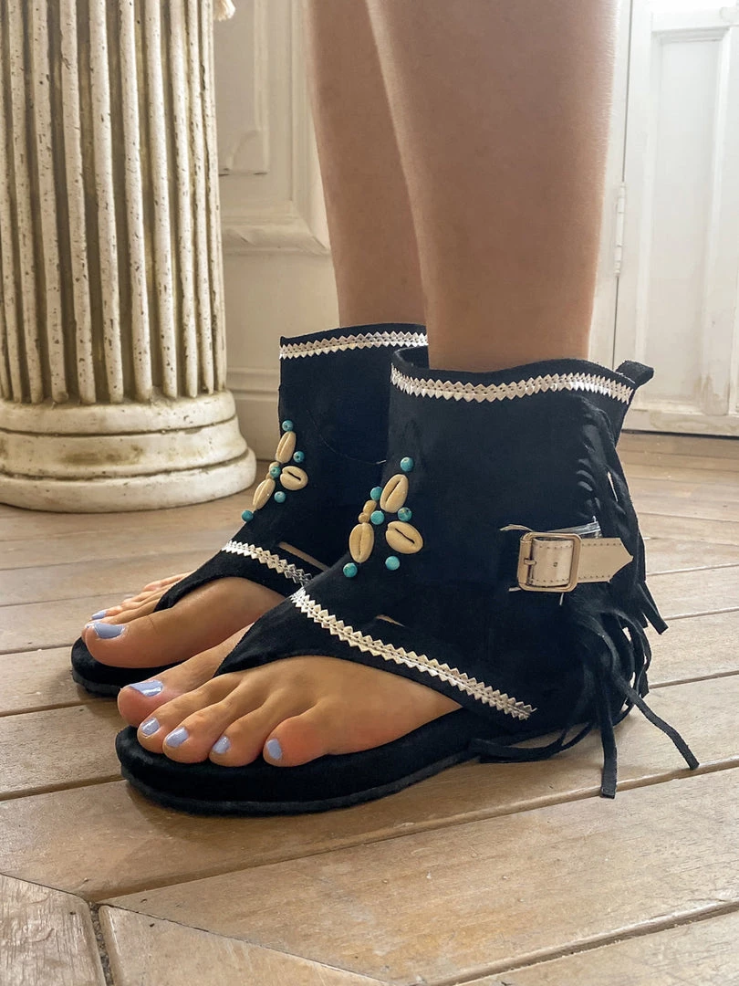Show off your pedicure in these bold gladiator sandals adorned with tassels and rhinestone for extra flair.