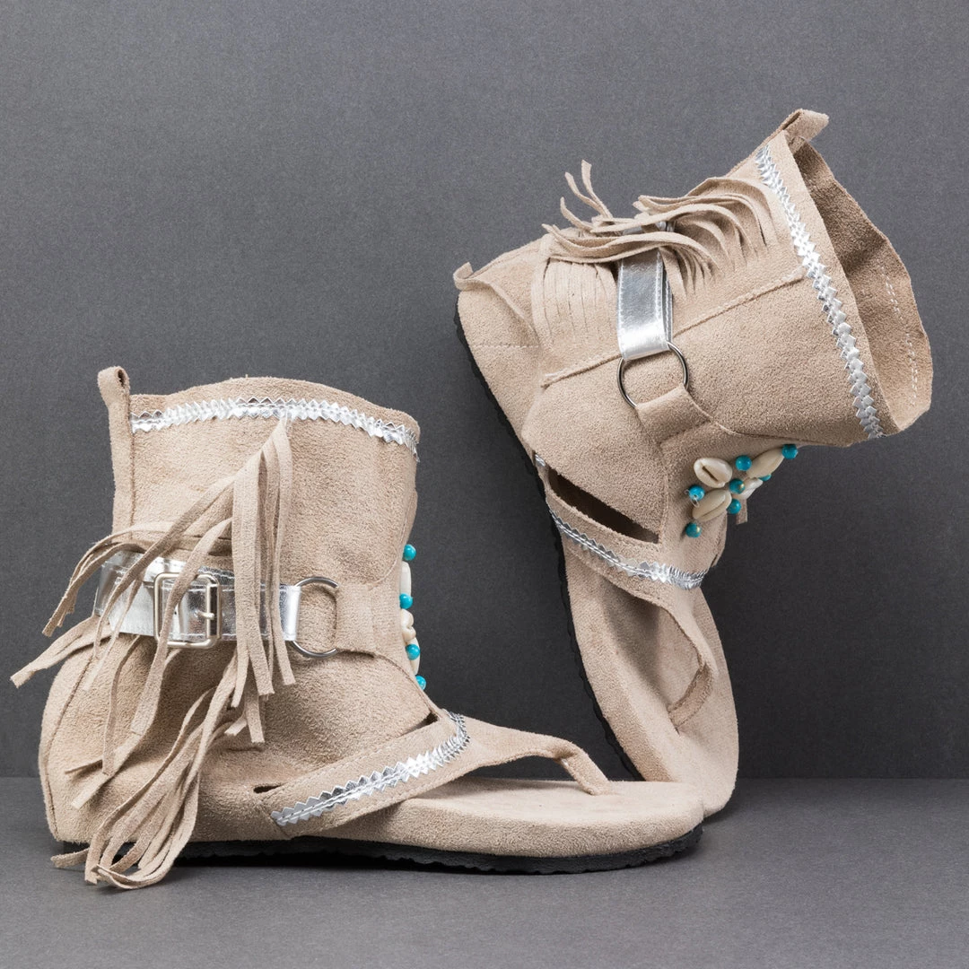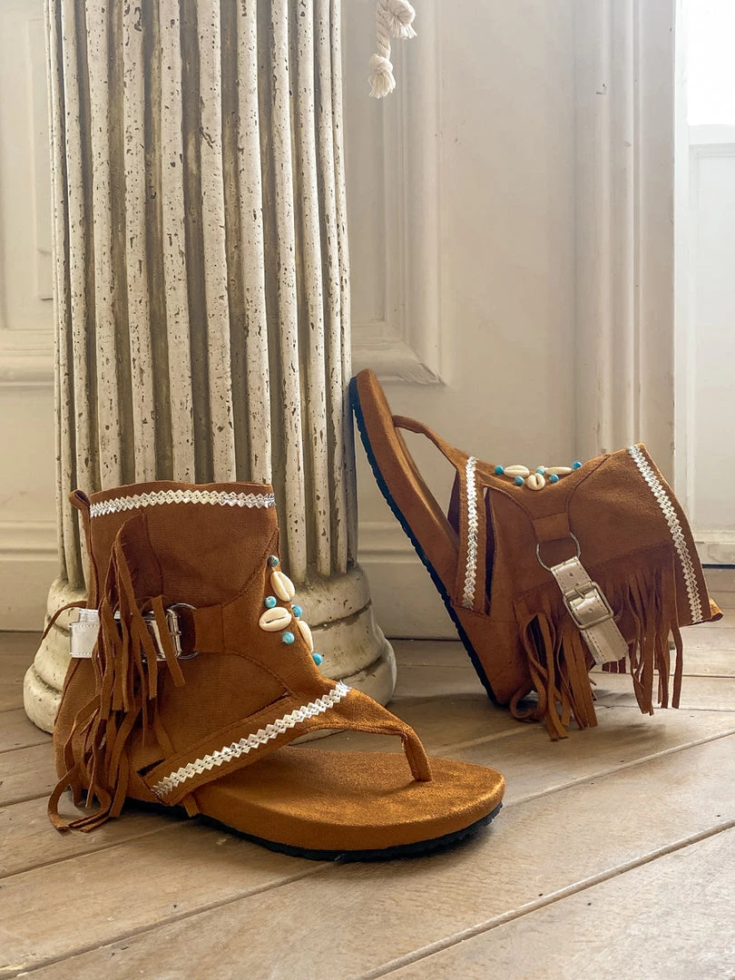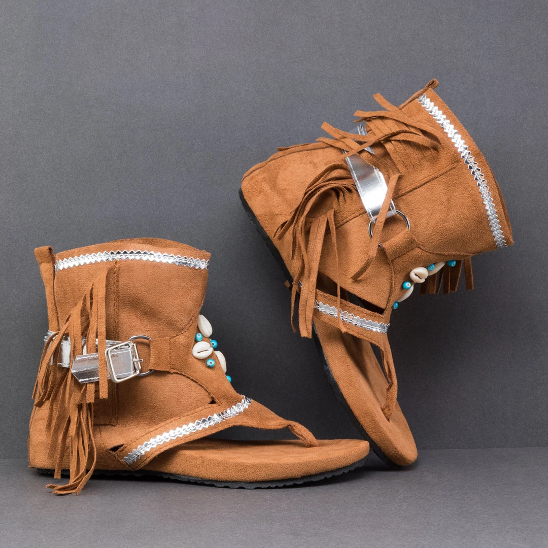 Show off your pedicure in these bold gladiator sandals adorned with tassels and rhinestone for extra flair.