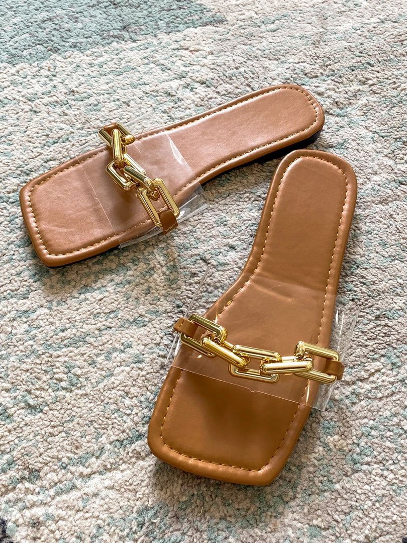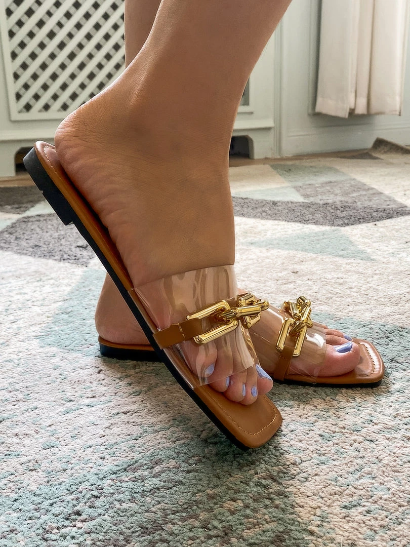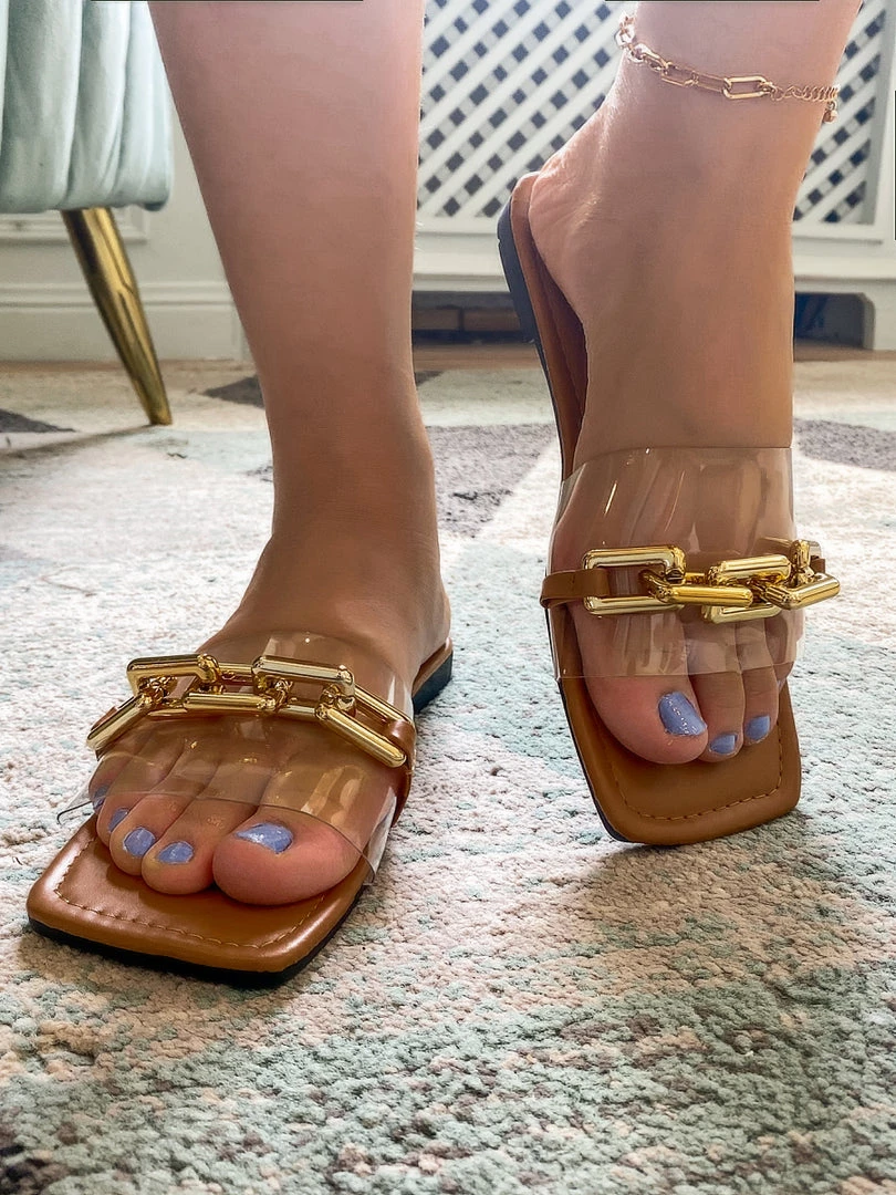 Pretty up your feet by slipping on this slide that flaunts a wide single band accented by a gleaming chain detail. A slip-fighting rubber sole makes for surer steps.